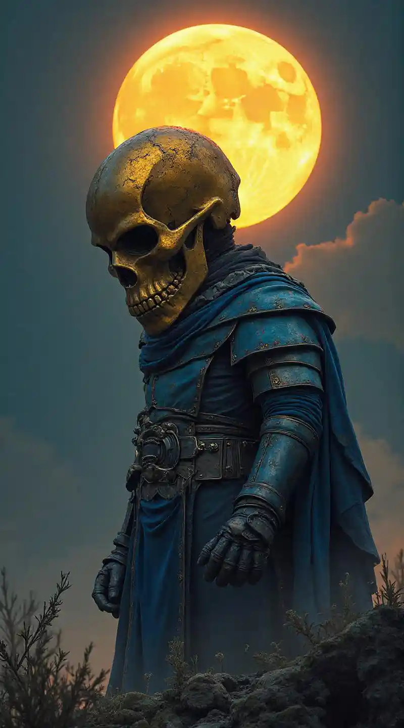 The night of the golden moon There is a confrontation between a warrior who covers his entire body with blue modern armor and a giant golden skull