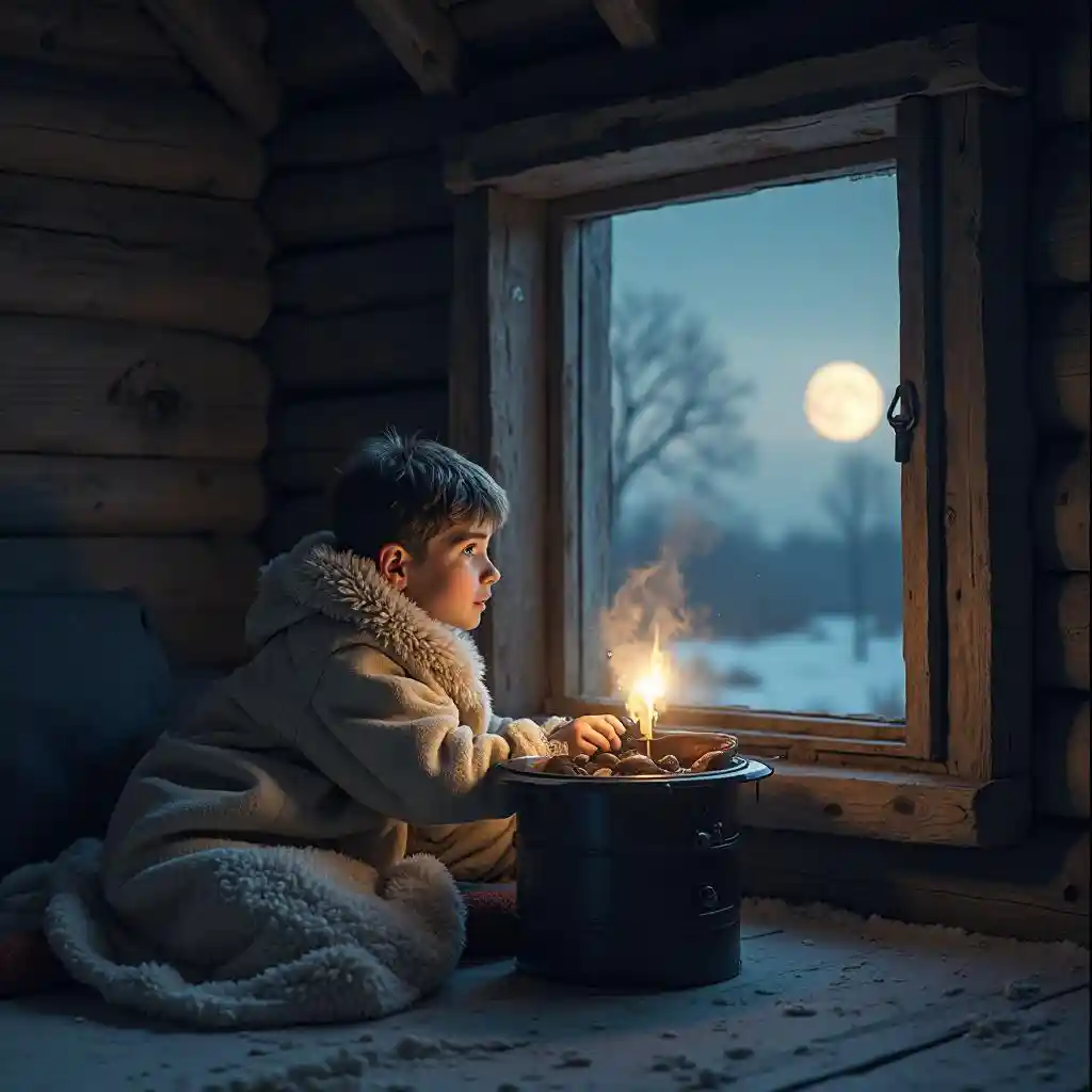 late evening, the boy lies in the hut on a warm stove under a sheepskin coat and looks out the window where the moon is shining