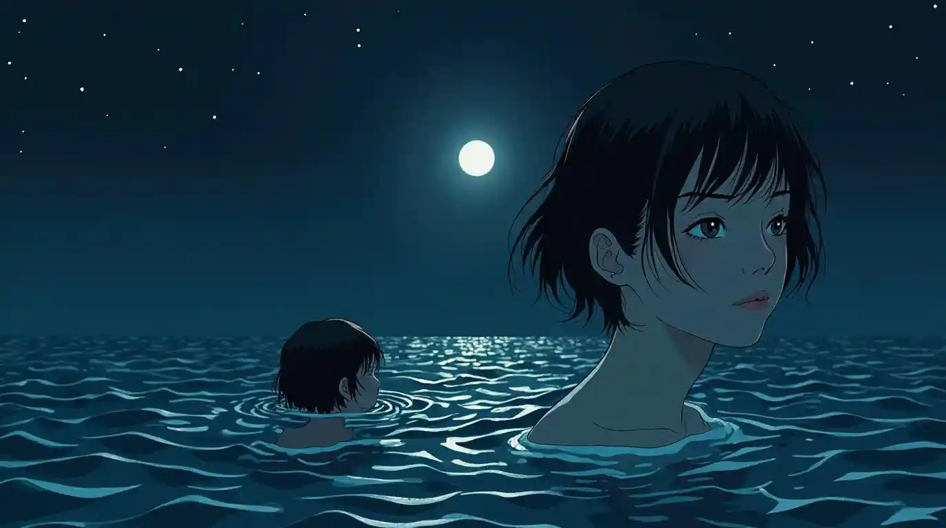 1980s Japanese Woman Sinking Under Moonlit Sea