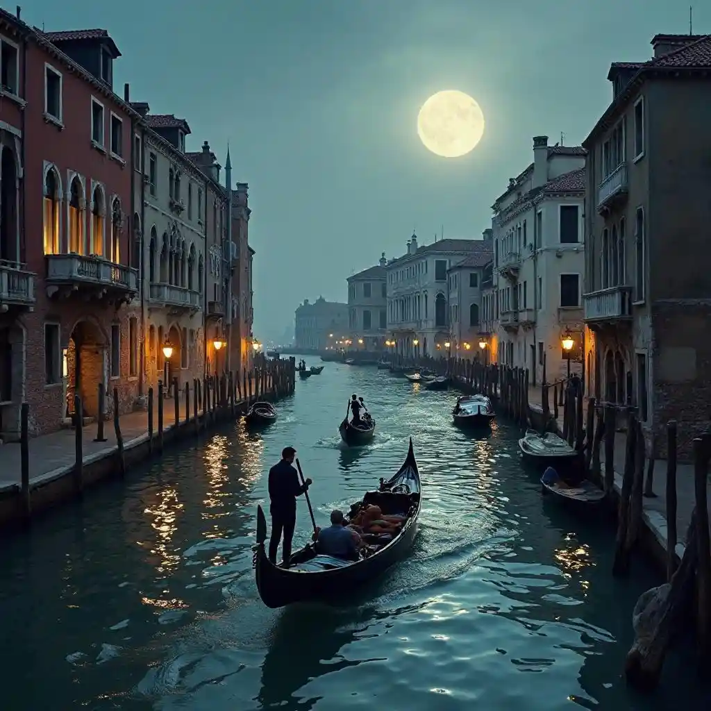 Bustling canals of Venice, with gondoliers serenading under moonlit bridges.