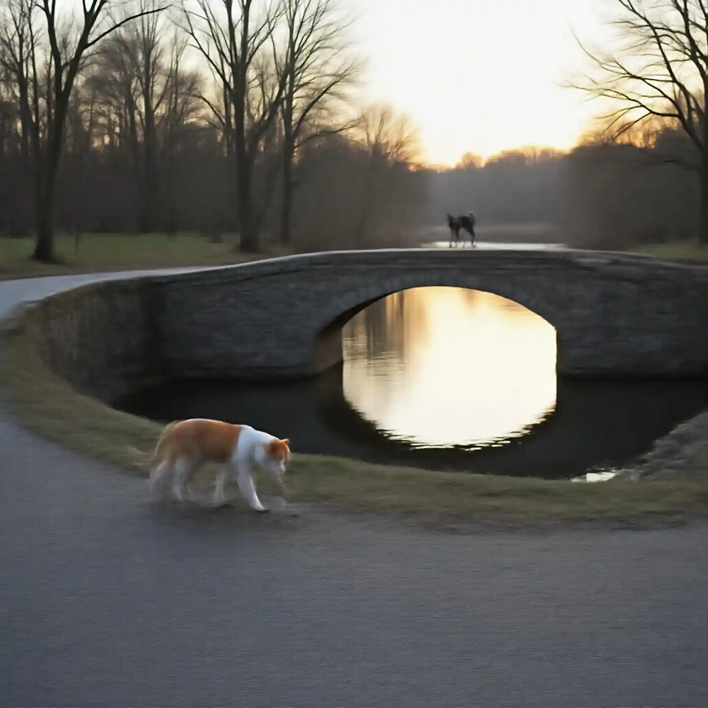 Cat and dog, Dog and cat walking together, River, Stone bridge over the river, Walking on the bridge, Calm morning, (Calm sunrise:1.2)、 ((8k)),(zPDXL2), ((maste