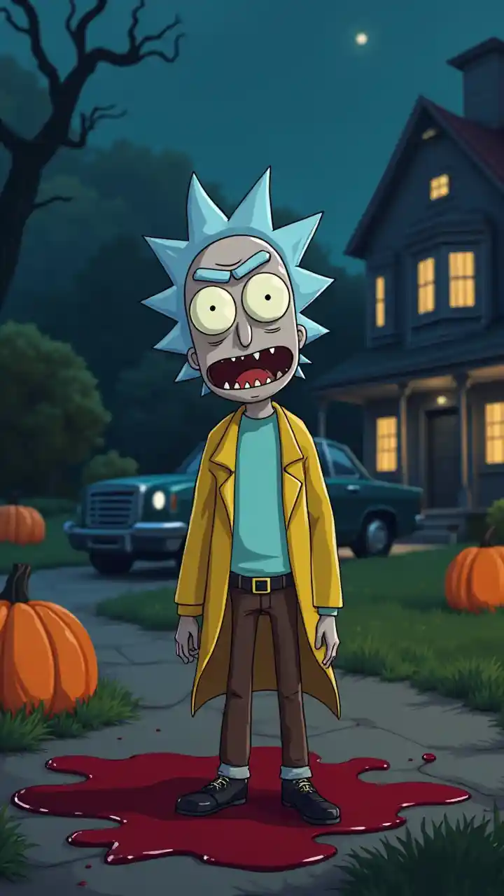 ScarlettA real life version of Morty from the Rick & Morty cartoon stands in front of a spooky background with a house, car, and pumpkins. The scene is set at night with a puddle of blood and a house with lit windows.