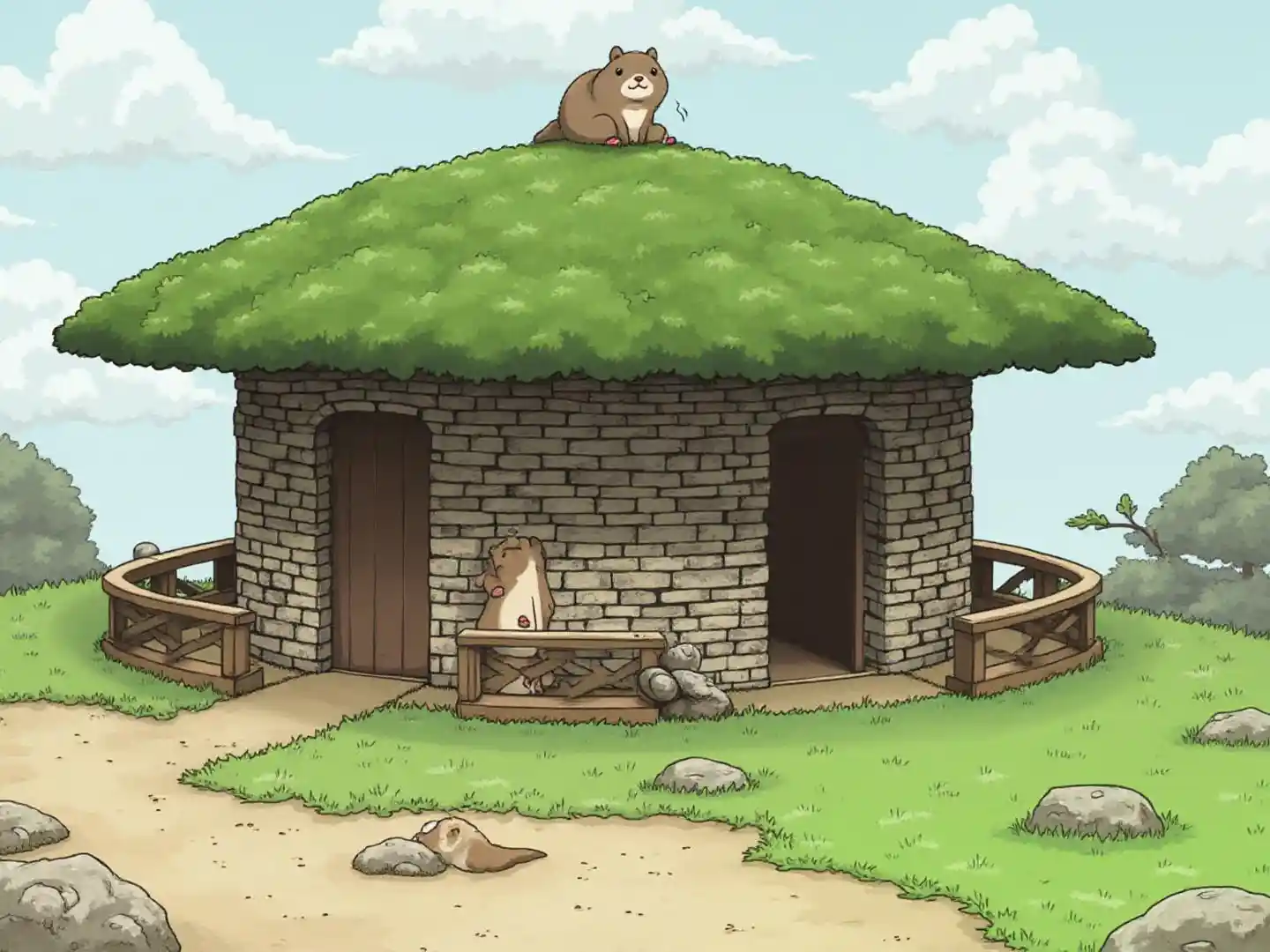 Mossy masonry cylindrical silo、cafe terrace、Mossy Plate-Like Circular Roof, 1girl, capybaras