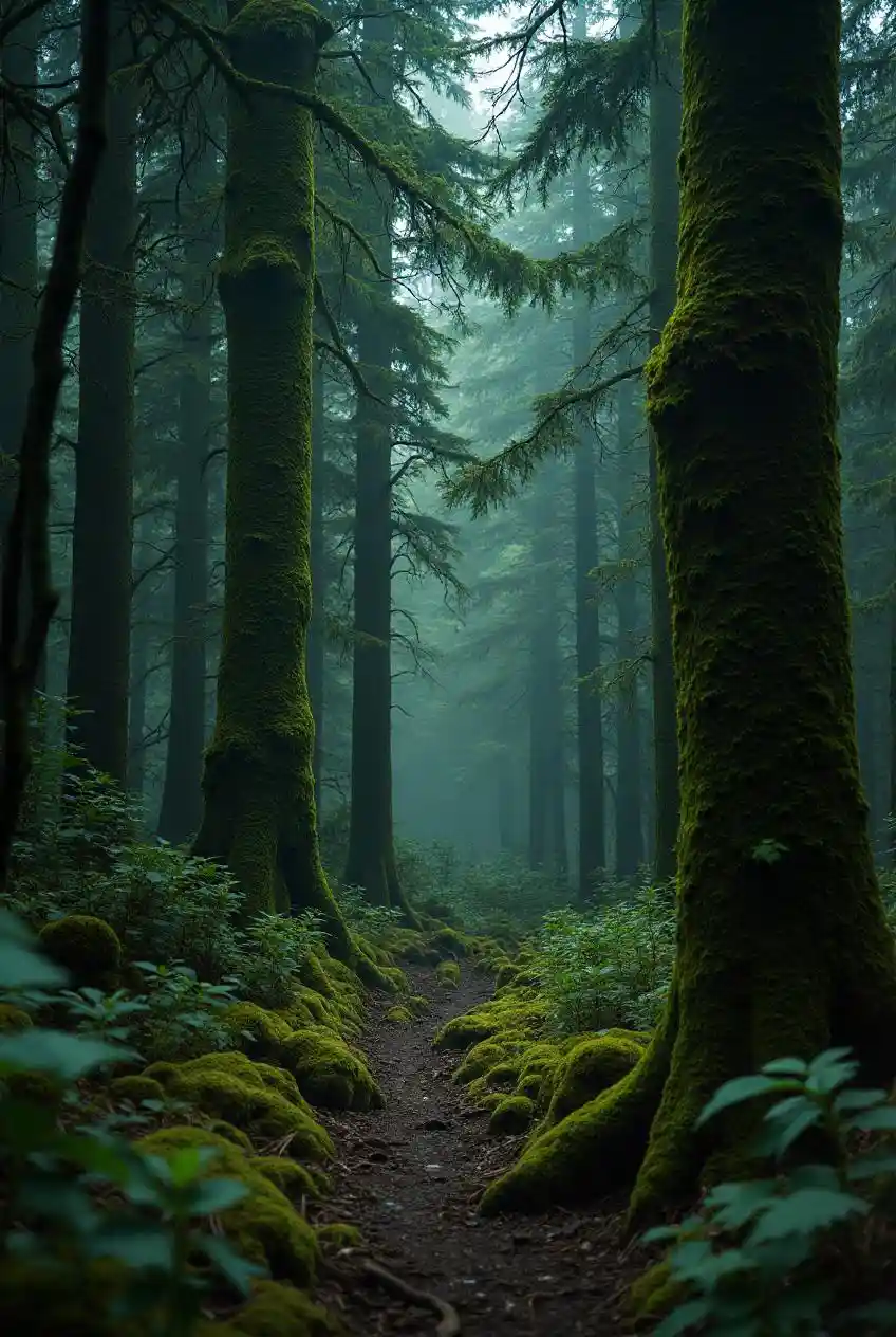 Moss-covered forest, with ancient trees and a floor lit by fireflies.