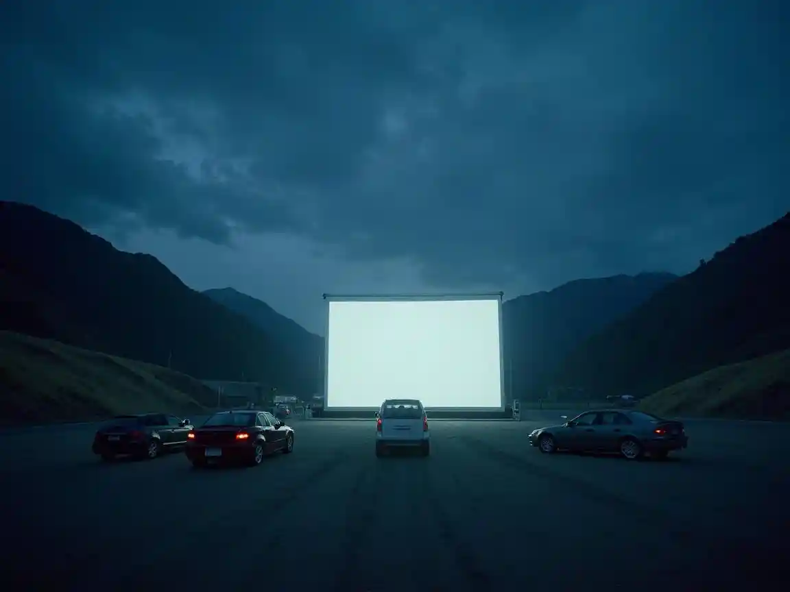 JulianA white screen cinema in the middle of an empty mountain, cars parked around it, nighttime, realistic photography, in the style of Rinko Kawauchi and Hidemi Shimura