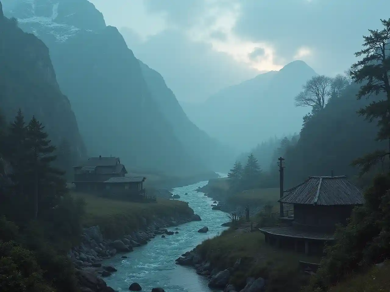 Dramatic Fantasy Scene of a Foggy Mountain Settlement