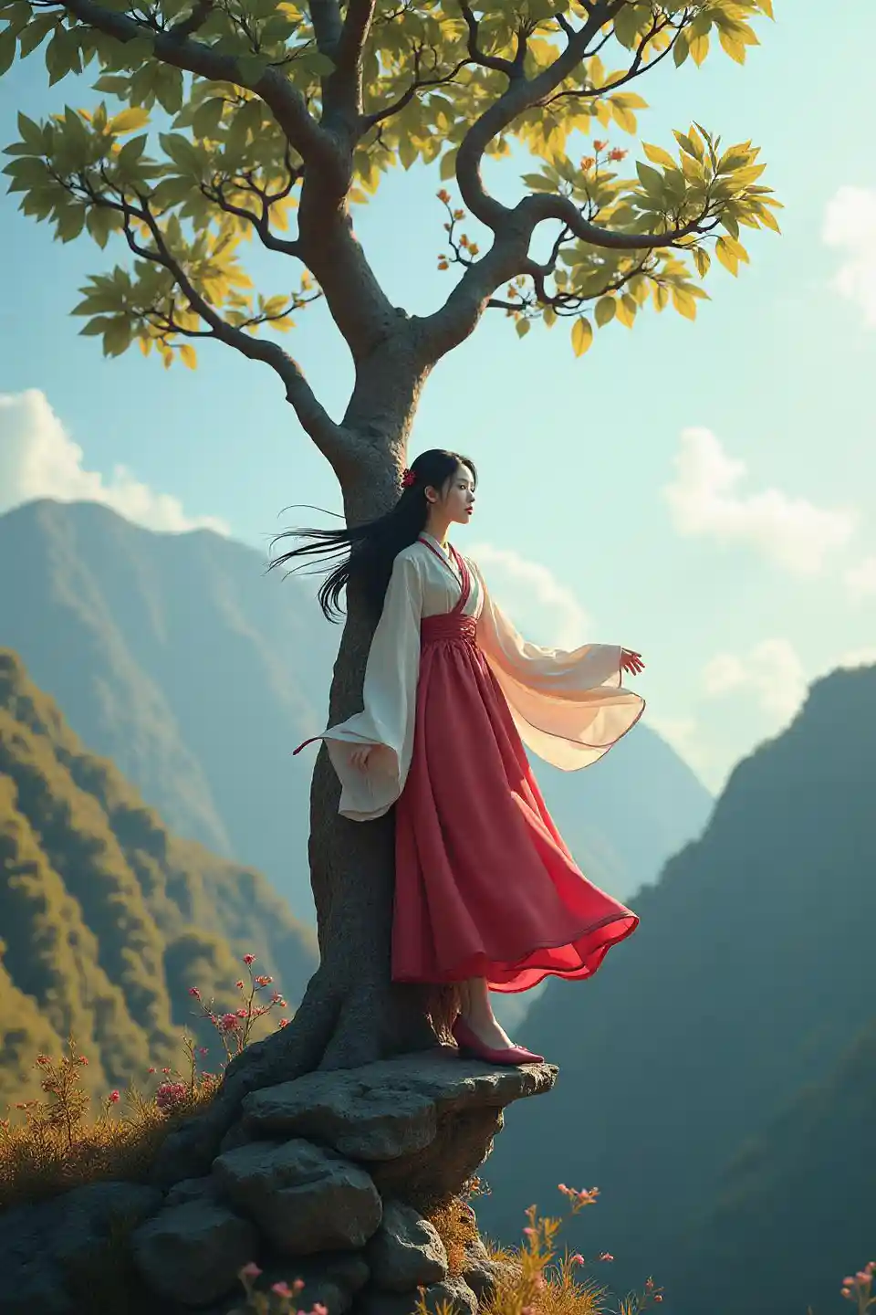 TinaA woman wearing a hanbok standing leisurely at the top of a tree with no sense of weight,A slight breeze blows away her clothes and hair, Deep in the mountains