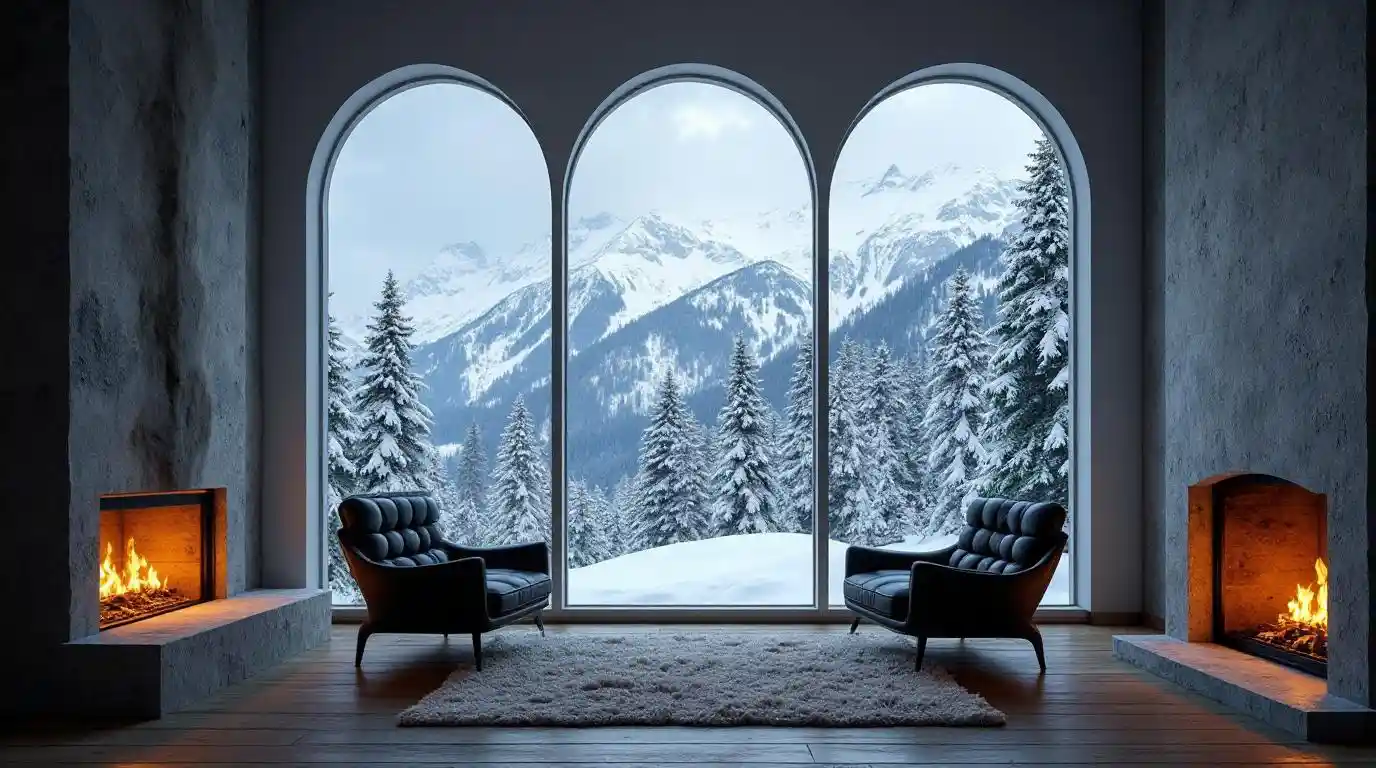This image depicts a modern interior with small arched windows that offer stunning views of snow-capped mountains. The scene is quiet and peaceful, with soft natural light illuminating the snow and tall evergreen trees outside. Inside, the room features sleek black armchairs and a stone fireplace with a roaring fire, providing warmth in the cold, icy environment. The contrast between the cold outdoor scenery and the cozy, minimalist interior creates a striking balance of tranquility and comfort.
