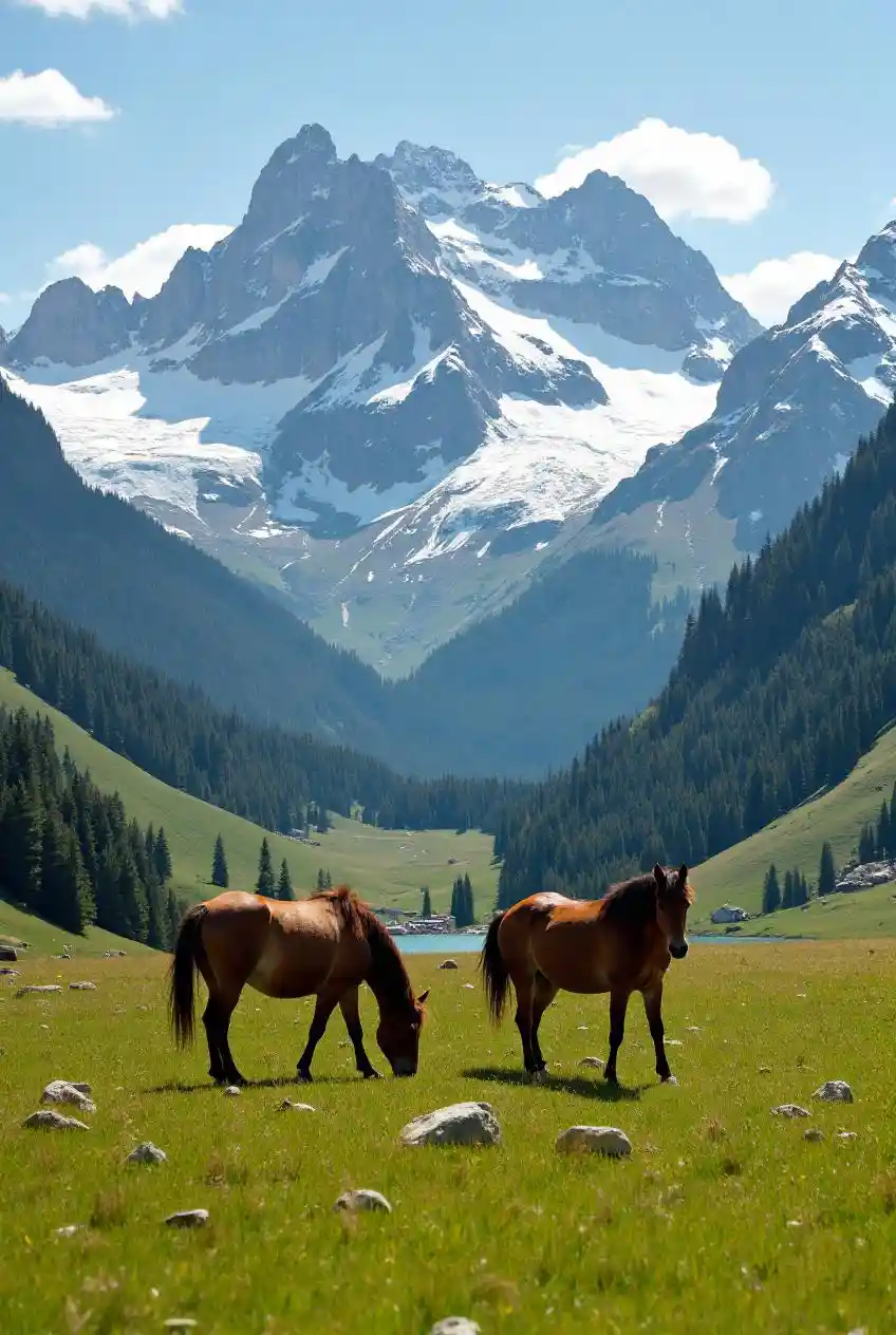 Grand alpine meadows, with wild horses grazing beneath snow-capped peaks.