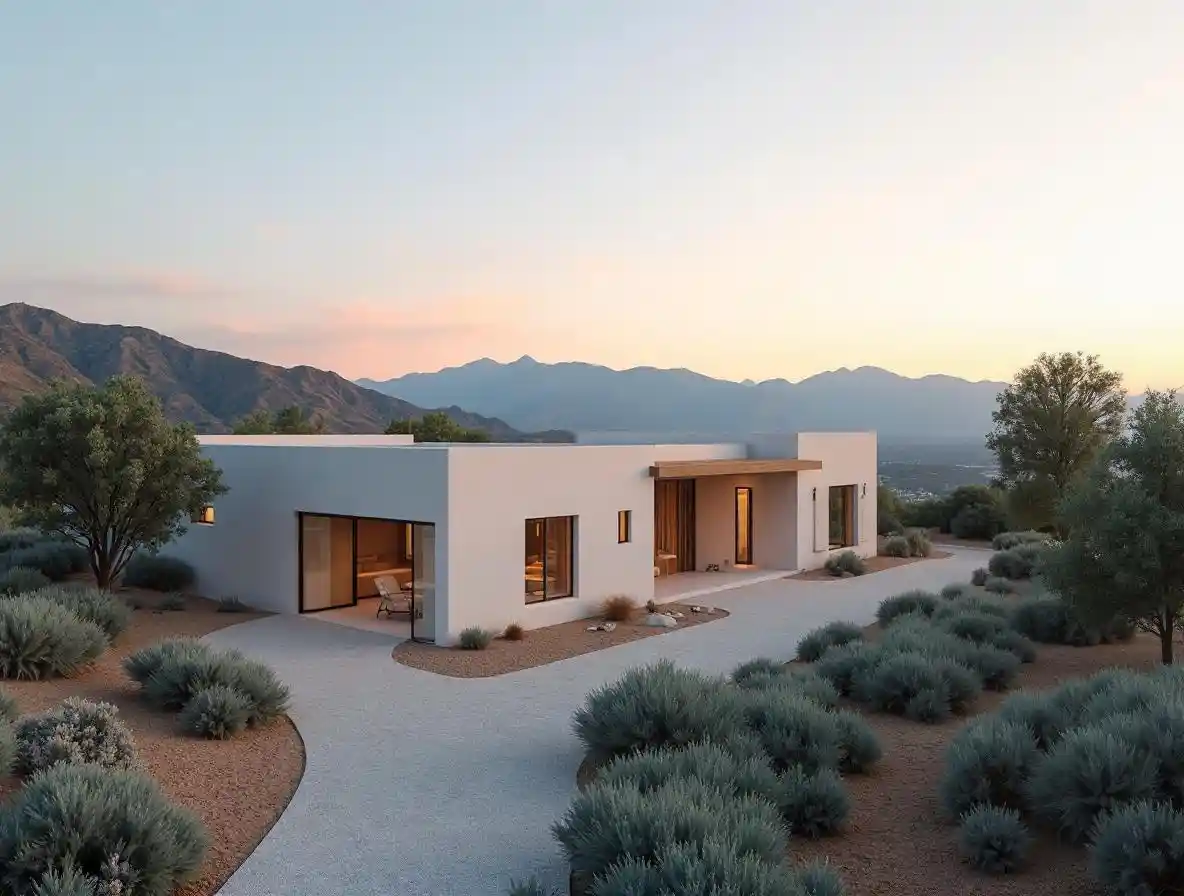 LaylaModern and simple architecture, walls facing the mountains without a roof. Surrounded by juniper trees, pastel sunsets, modern architecture, calm atmosphere.