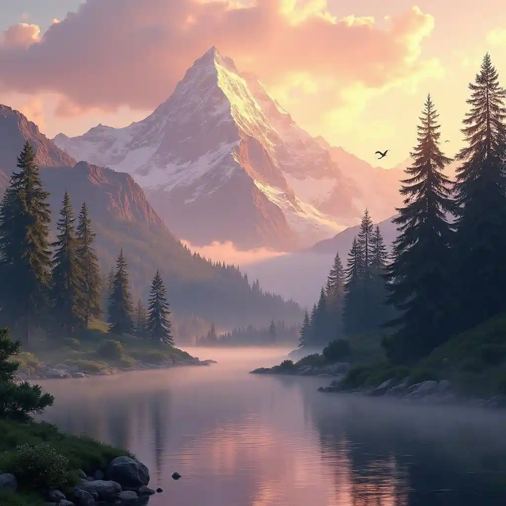 "An awe-inspiring scene of a serene sunrise over a majestic mountain range, with the first rays of golden sunlight gently illuminating the snow-capped peaks. In the foreground, a calm river flows smoothly, reflecting the warm colors of the sky—shades of pink, orange, and soft purple. The surrounding landscape is lush with greenery, with tall pine trees lining the riverbank. Mist rises gently from the river’s surface, creating a dreamlike, peaceful atmosphere. Birds can be seen flying in the distance, adding a sense of tranquility and connection to nature."