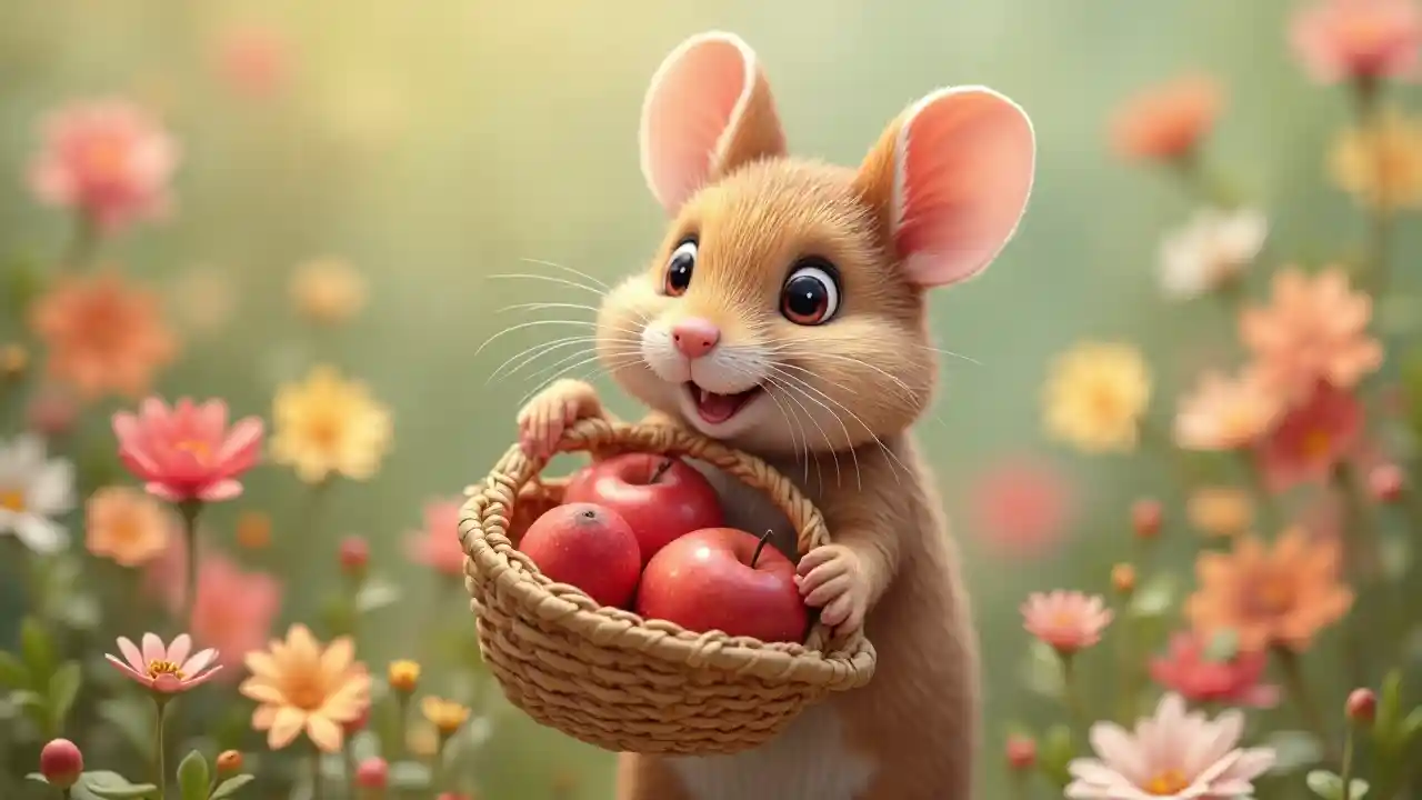 GraceSmiling cute mouse in flowers with contrasting colors holding basket with red apples