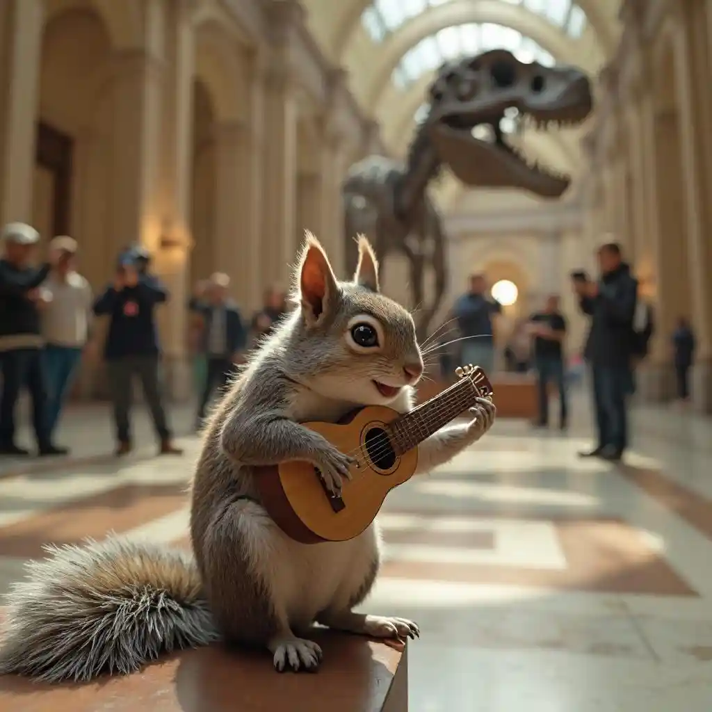 A realistic and charming scene of a joyful squirrel sitting on a bench, playing a cavaquinho inside a grand museum. In the background, a large dinosaur skeleton is on display, with several people filming the squirrel from a distance, amused by the delightful moment. The squirrel, with its fluffy tail and tiny hands, strums the cavaquinho with enthusiasm. Soft museum lighting highlights the details, reflecting off the marble floors, creating a warm and inviting atmosphere. The scene is beautifully cinematic, with a gentle filter enhancing the magical and engaging ambiance