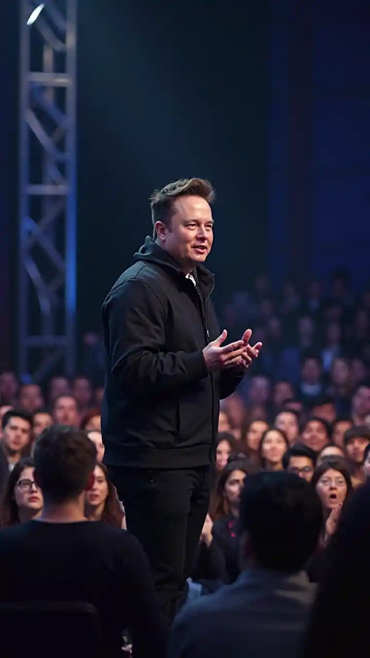 ChloeElon Musk is giving speech on the stage, under the stage are meme coins characters cheering