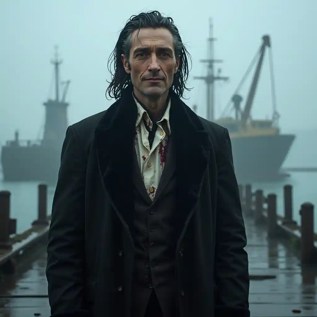 A (((ashen-skinned, Eastern European man in his mid-40s))) with a haunting, statuesque face and glacial features. His shoulder-length black hair is slicked back with damp, streaked by strands of early gray. His eyes are ((icy gold with radial bursts of amethyst)), glowing faintly in the fog like witchlights. He wears a ((long black Victorian coat with a velvet collar)), open to reveal a ((blood-smeared high-collared white shirt)) and broken manacles still hanging from his wrists. Despite being bound, he stands tall — calm, regal, almost otherworldly. The fog thickens unnaturally behind him on the ((abandoned harbor pier)), where ((shapes of old ships and crooked cranes shimmer like memories)). His mouth curls into a smile that suggests neither threat nor safety.