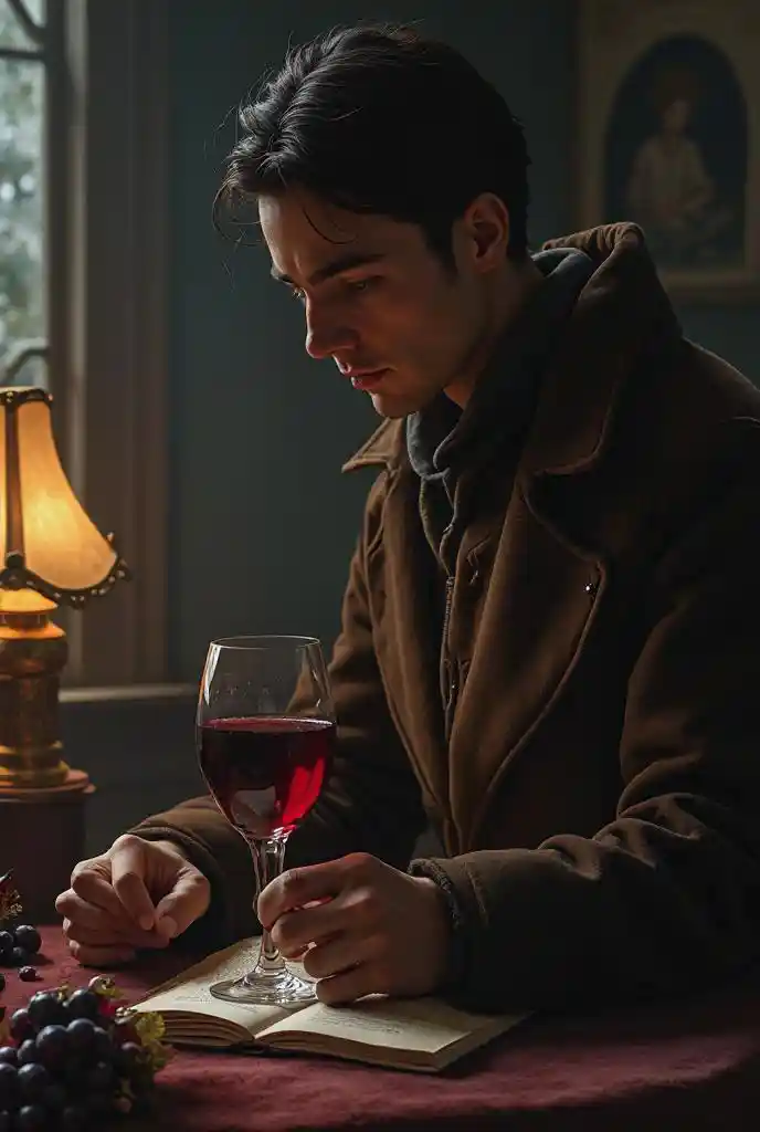 A person with a cunning expression、One Suffering Person、collapsing wine glass、Mystery novels、grape juice in a wine glass、 comments、Gas lamp light、Medieval Londo