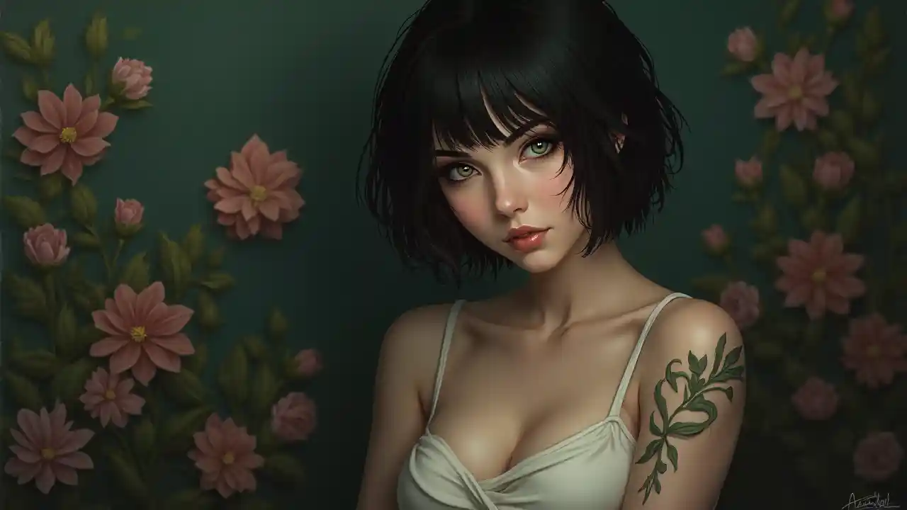 headshot lady with short dark pixy cut hair, green eyes, strapless shirt, tattoo on arm, realistic, smooth skin, painting, flowers in the background, dark moody, mistcal, dramatic