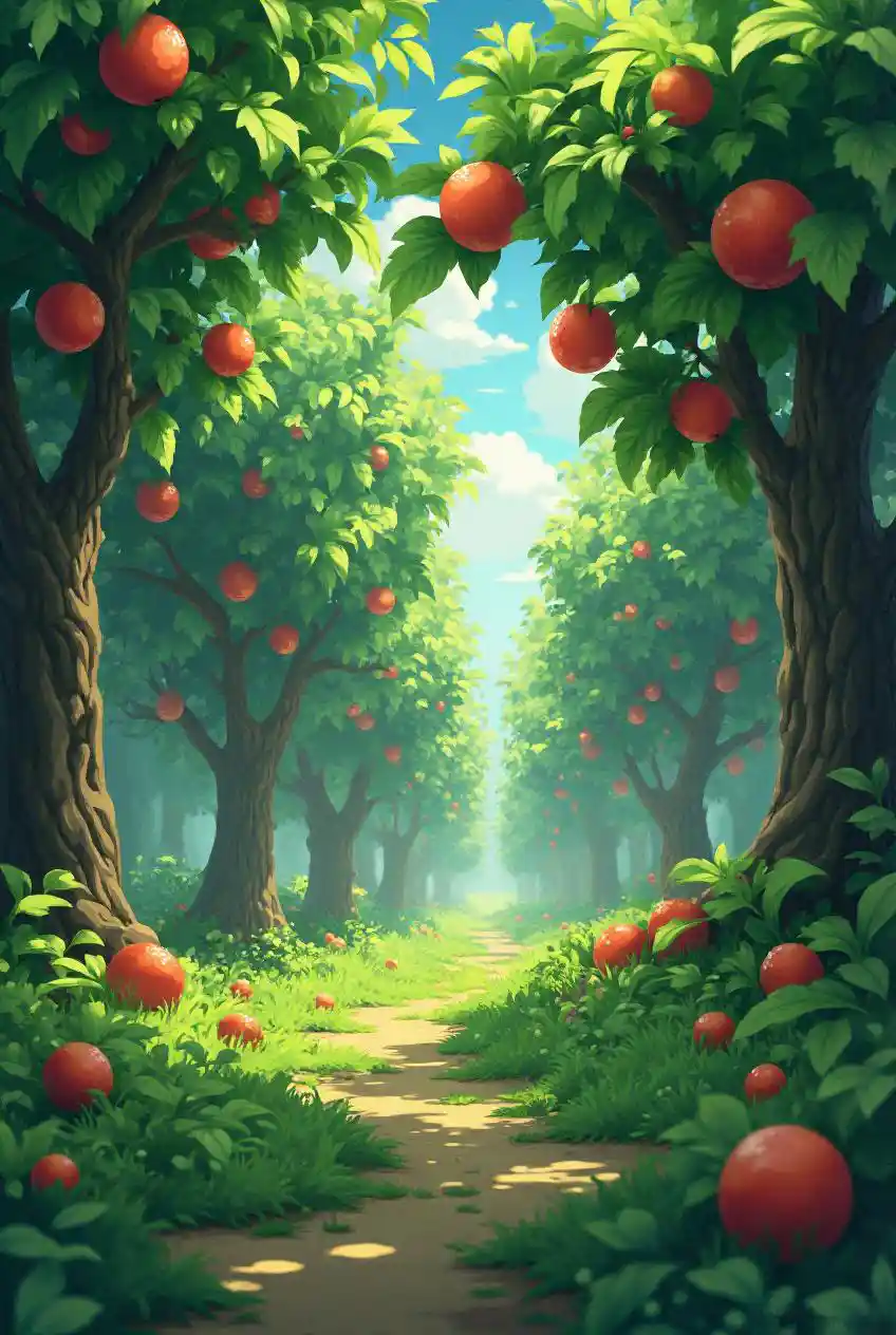 Lush orchard, fruit granting mystical abilities, akin to magic-infused anime settings.