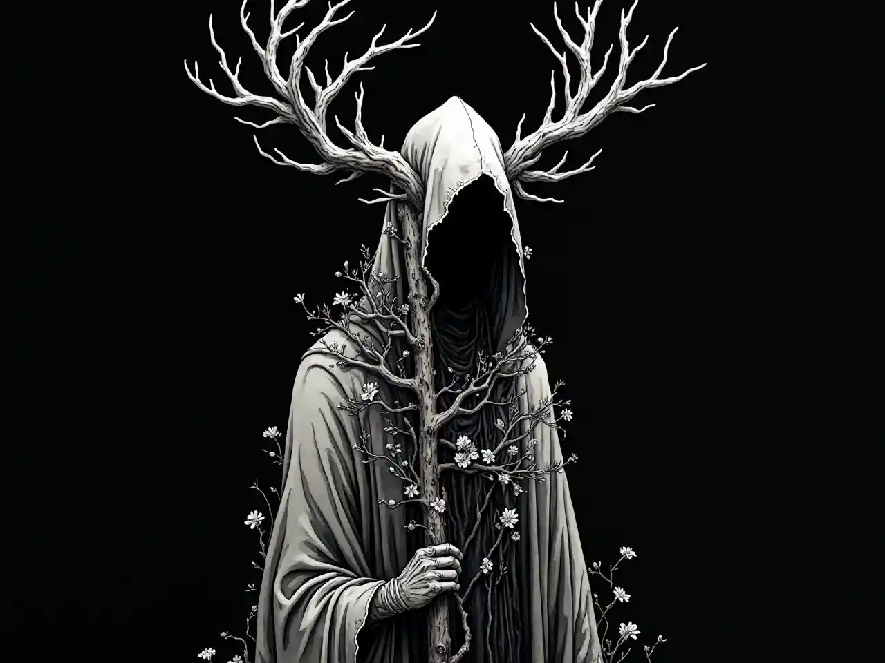 masterpiece, best quality, high res, perfect lighting, absurdres,1man, ethereal forest spirit with antler branches growing from hooded figure, monochromatic white on black background, dark fantasy art, spectral cloaked entity with empty face void, twisted roots growing from lower body, skeletal tree staff with climbing vines, mystical woodland guardian, ethereal flowing robes with tattered edges, dark gothic illustration, branches and twigs forming crown-like structure, ink illustration style with dripping effect, haunting silhouette against pitch black background, detailed botanical elements with small leaves and flowers, solemn otherworldly presence,Dark Light Contrast,DDARK