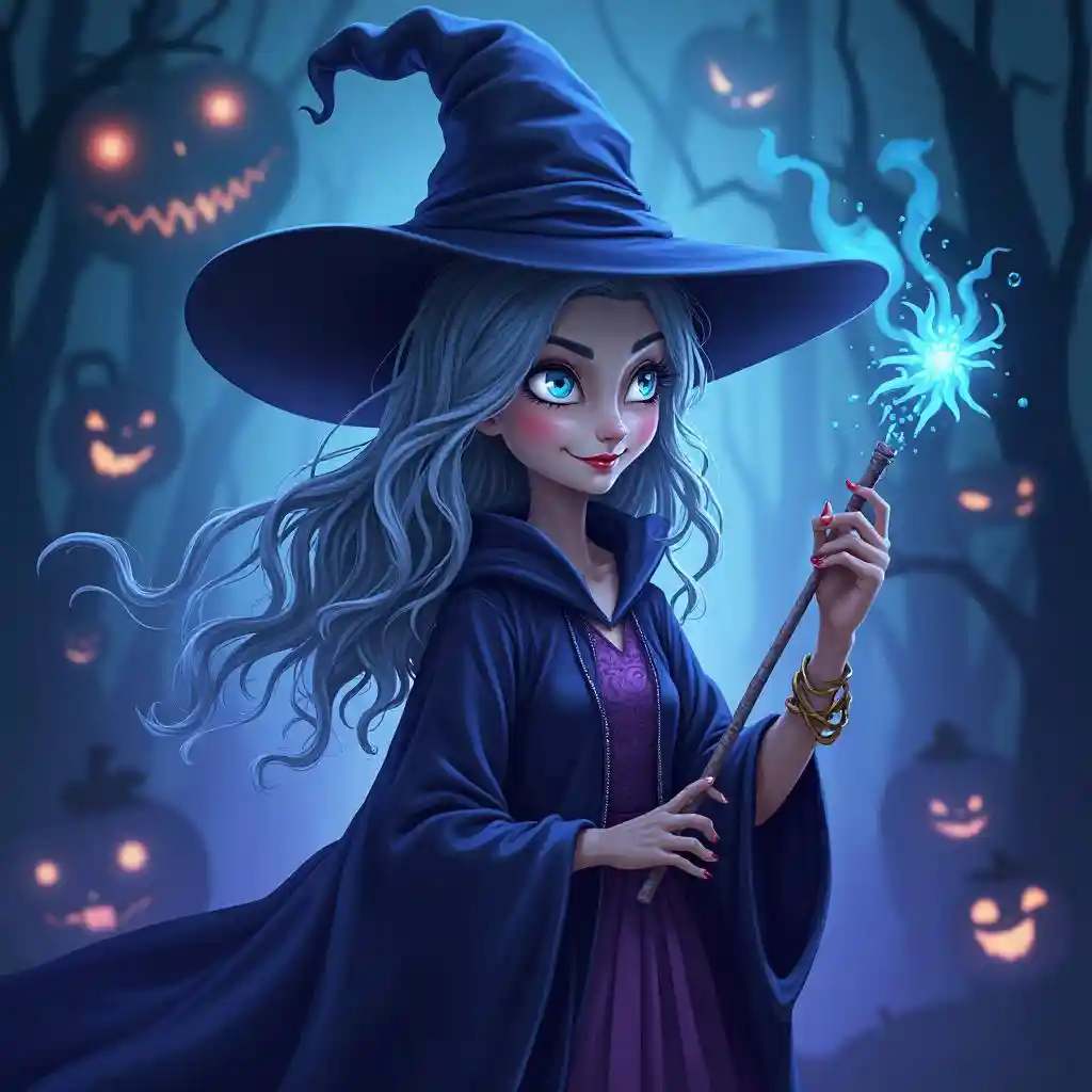 A witch with silver hair and pale skin, wearing a pointed hat, holding an enchanted wand. She is surrounded by a magical blue and purple mist, which forms the smiling and scary faces of Halloween creatures. His eyes shine with a mysterious light.