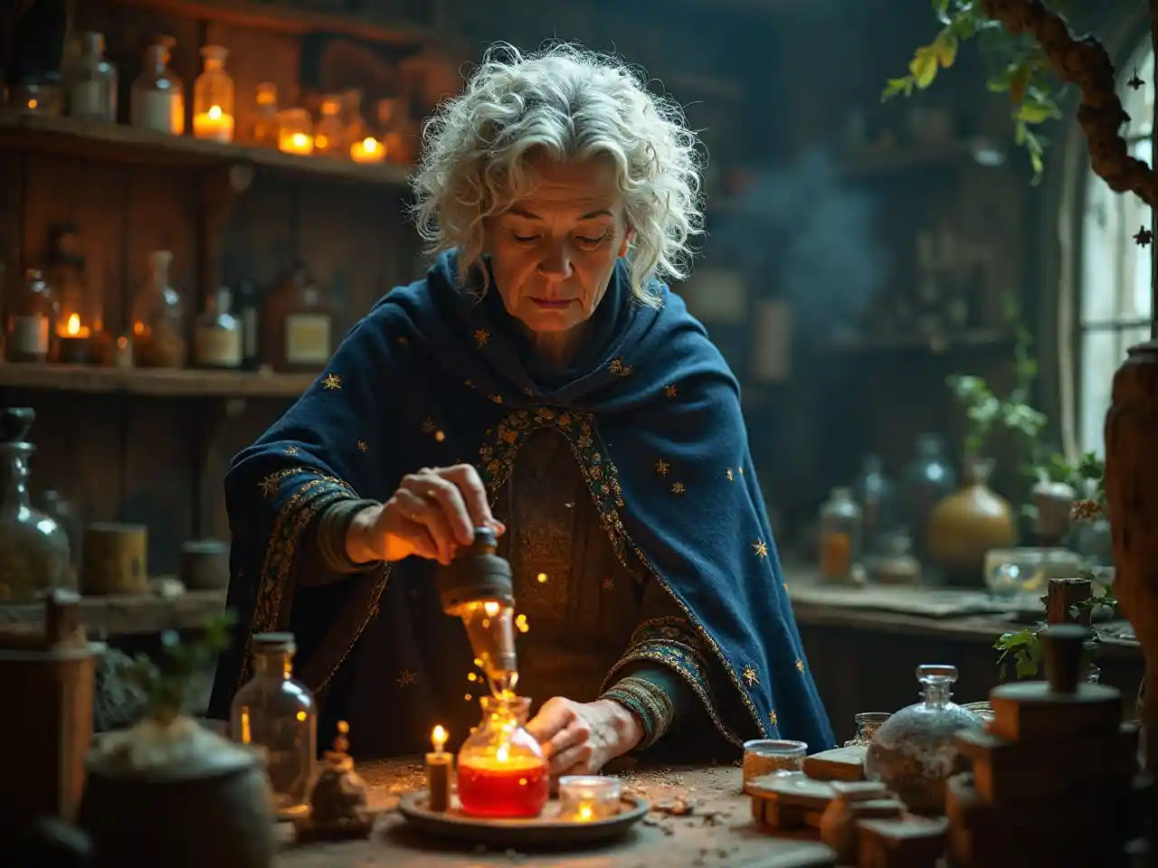 Mixing potions in a glowing apothecary, a 82-year-old White woman with curls wears a cloak with star embroidery. Bubbling vials and dusty tomes frame her, her precise pours radiating curiosity and mystical charm in a cozy, sci-fi setting. Her hands brew wonders.