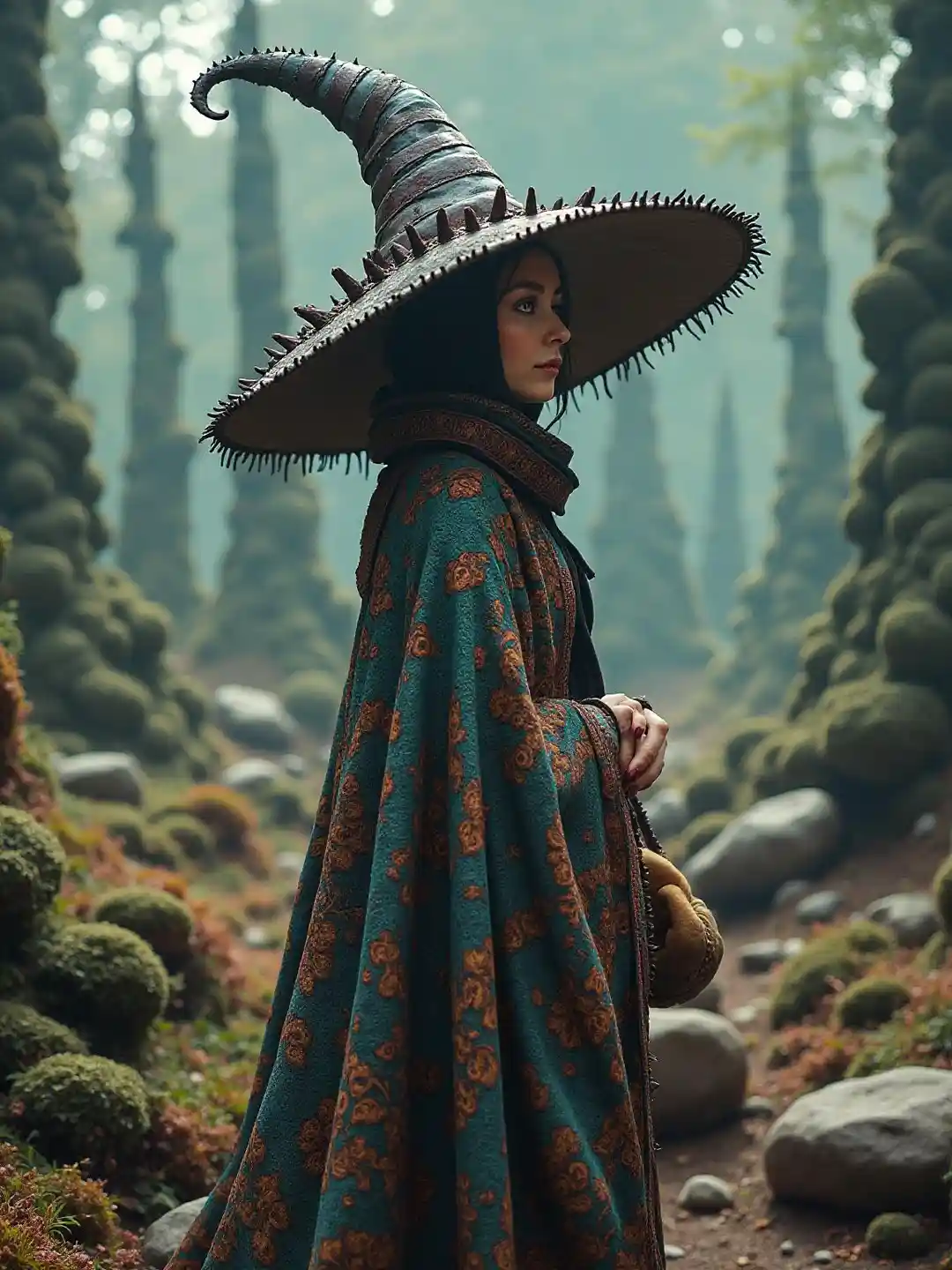 Tall Spines Reminiscent of Wizards and Mystical Beings,Ornate Patterned Cloak,The woman in the hat {x} is surrounded by an otherworldly landscape full of bizarr