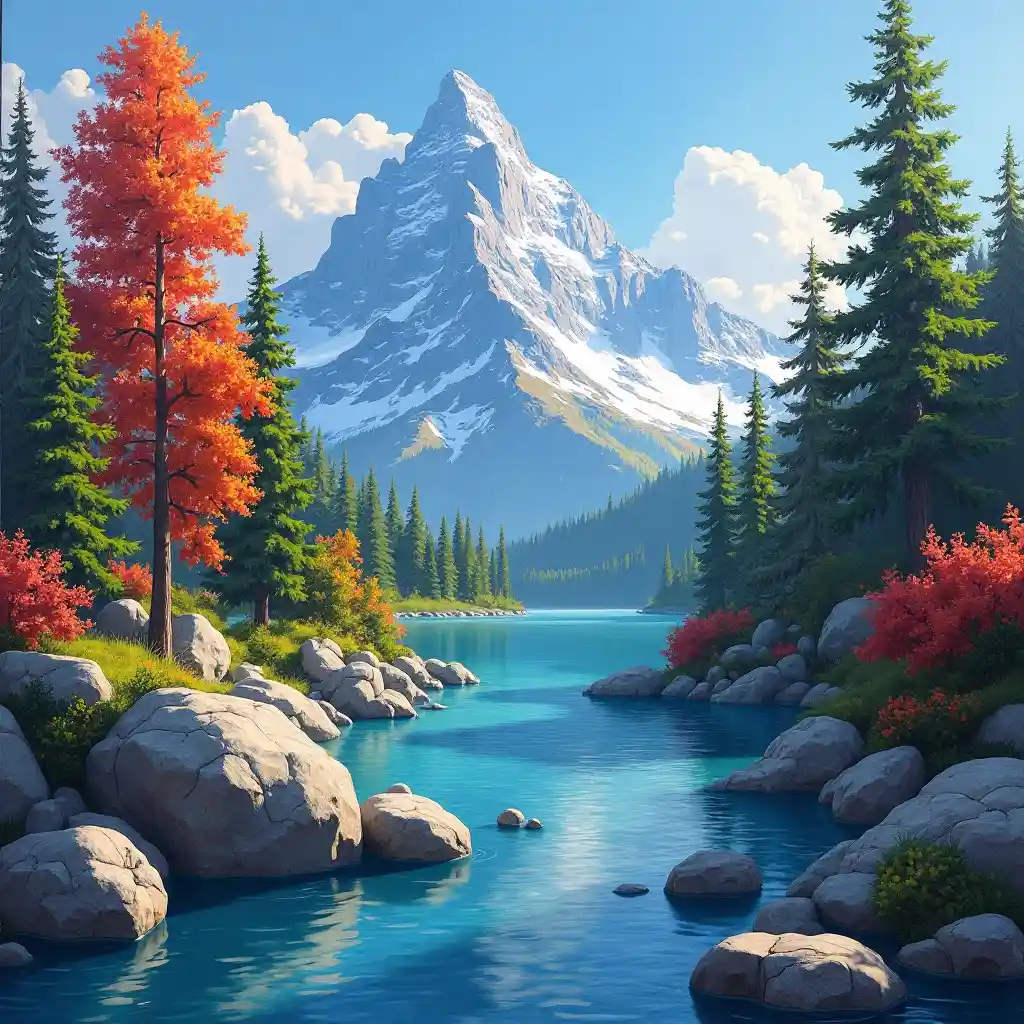 Majestic Mountain River Painting with Vibrant Nature