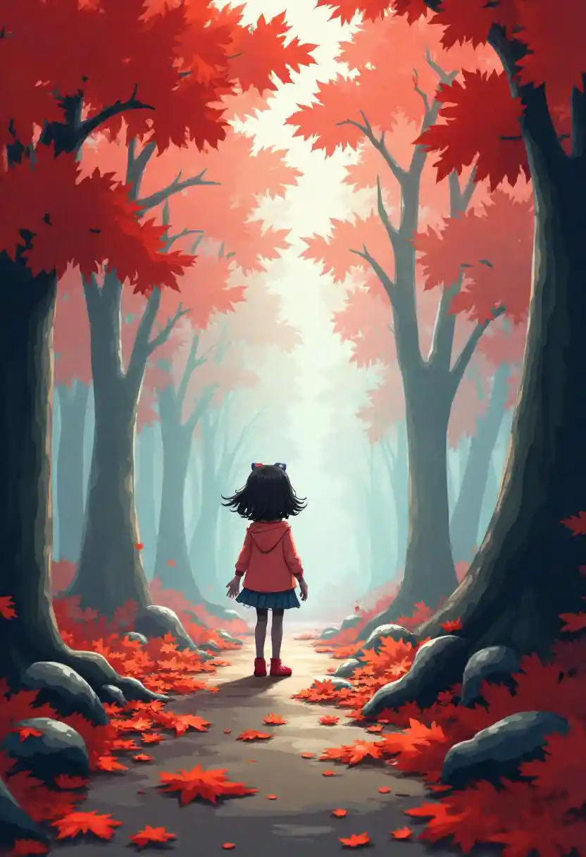 Mwang((microworld:1.5))、(WONDERFULLY IN A WONDERFER FOREST:1.5)、((大人Girlが恐る恐る探検する:1.5))、((huge red maple leaves are blown away by strong winds and scattered at break