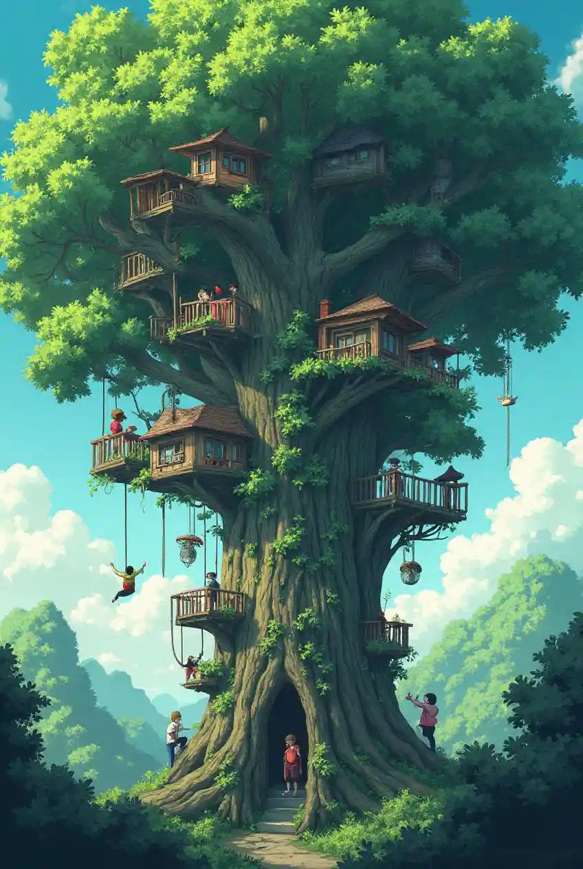 Immense tree city, houses in branches, residents swinging on vines, reminiscent of nature-centric anime.