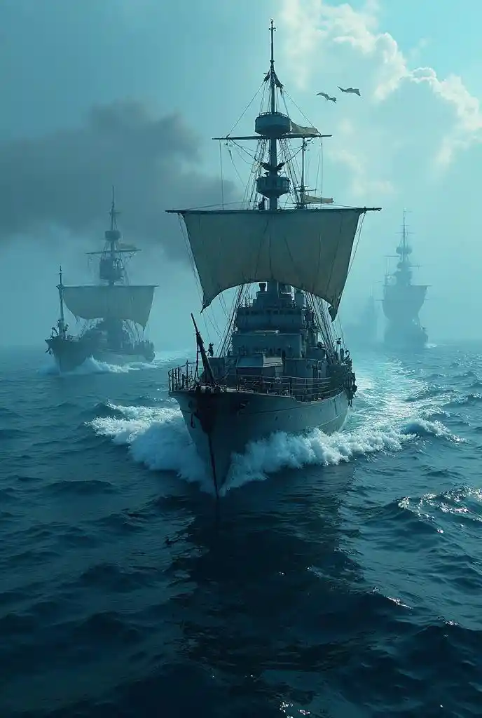 Braydenand are surrounded by pirate ships floating in a deep blue sea。The battleship is made of steel、it is equipped with modern weapons and sensors、the military flag