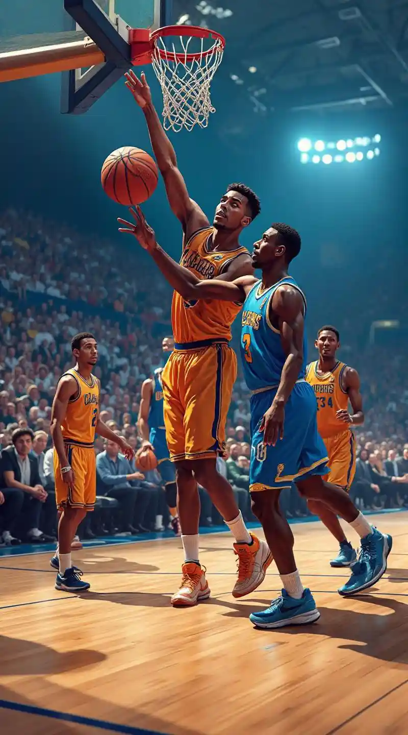 illustration , masterpiece , top quality without window , ultra-detailed , Realistic depiction of a basketball game on a basketball court,NBA, 3/4 body. (rock c