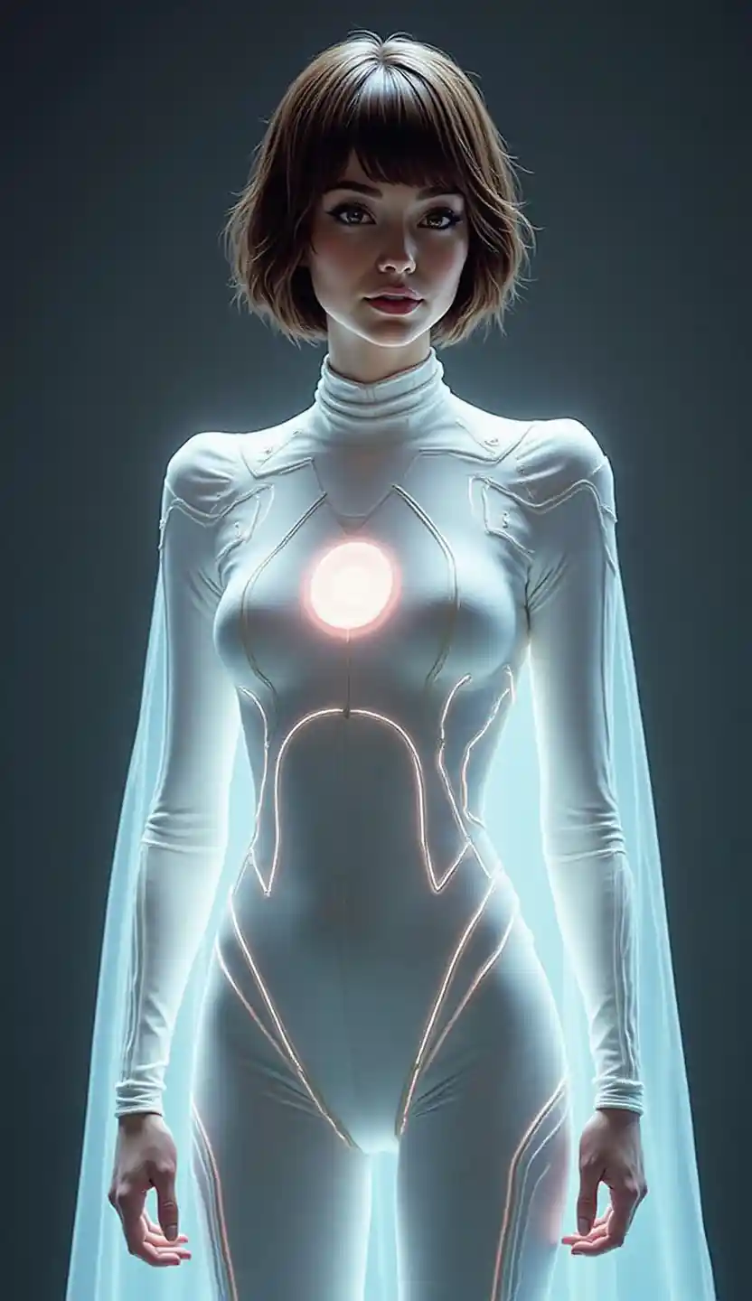 female, white transluminescent bodysuit armor, Glass textures, neon lights embeded craft, translucent materials, see-through sleek cape, short brown hair, circu