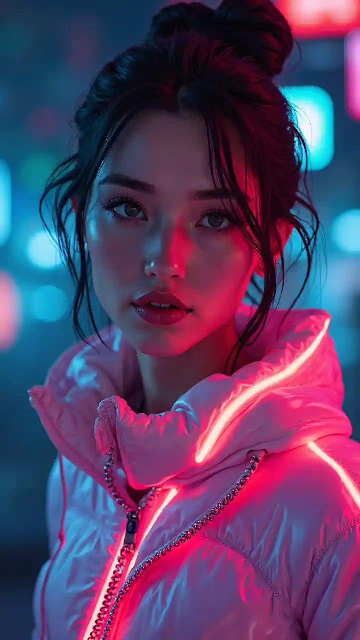 HenryDetailed portrait neon cleaner woman, cyberpunk futuristic neon, reflective puffy coat, perfect face, fine details