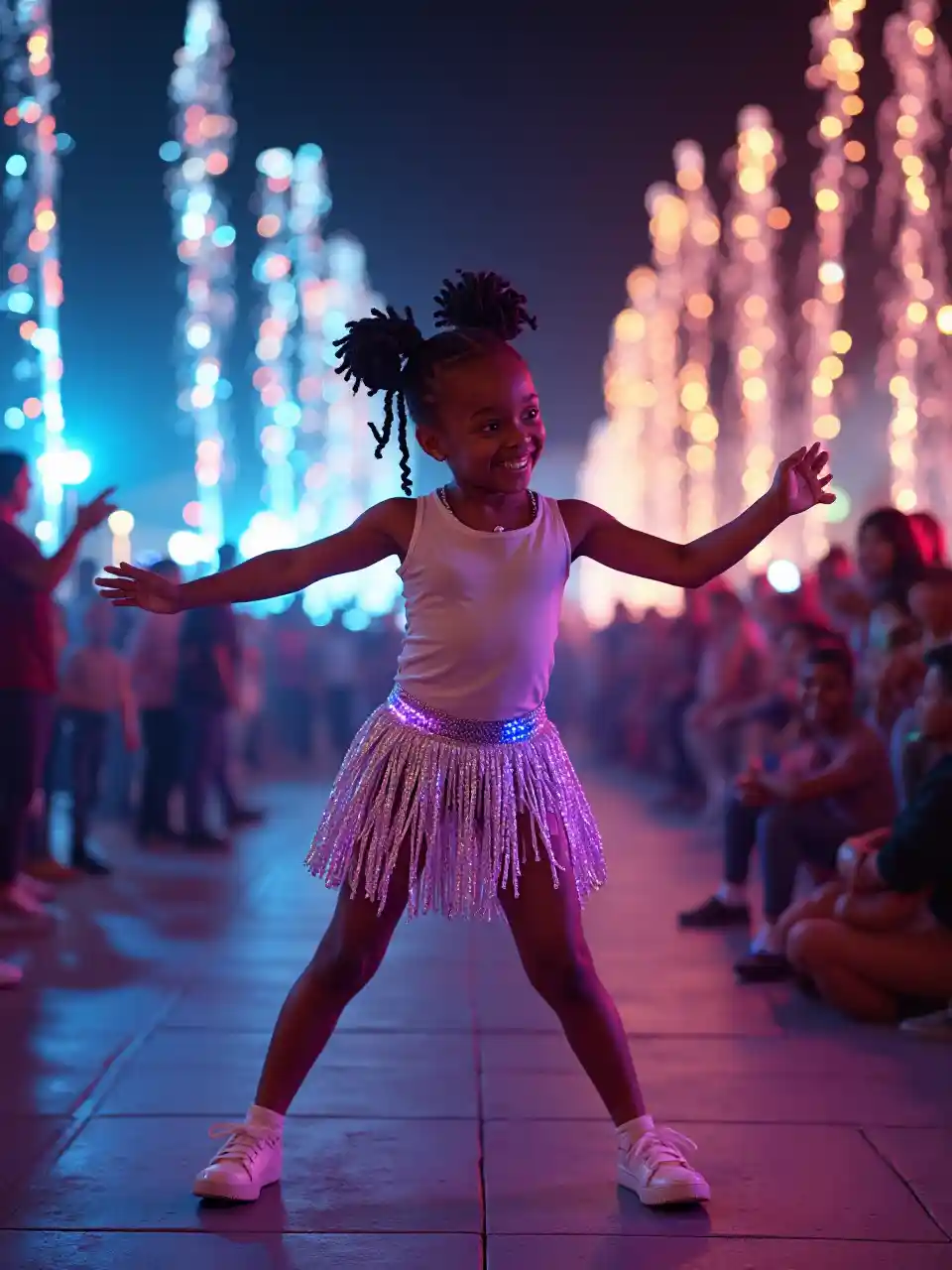 A 9-year-old Black girl with twists performs a dance in a neon-lit plaza, dressed in a skirt with LED fringes. Cheering crowds and holographic fountains frame her, her confident moves radiating charisma and vibrant energy in a lively, urban scene.
