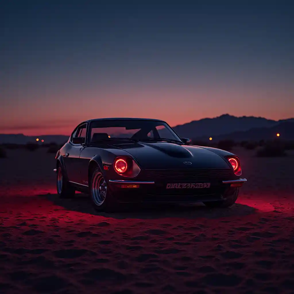Datsun 280z car against a night desert background, red neon light, neon lamps, twilight, mountains on the horizon, contrasting rich colors, deep dark atmosphere, high quality image, professional shot.