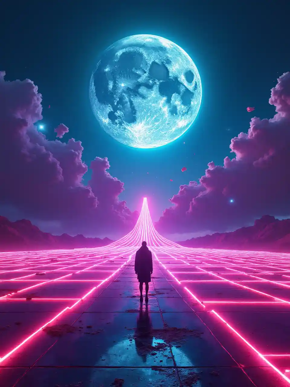 A surreal neon-soaked dreamscape inspired by longing and detachment, evoking the melancholy. The scene features a solitary figure standing on the edge of a glowing, endless neon grid stretching into the infinite horizon. Above, a massive, surreal moon dominates the night sky, its surface textured with intricate, vivid details and surrounded by swirling, ethereal clouds of electric blues and neon pinks. Bright neon colors radiate throughout the composition, creating a dynamic interplay of vibrant purples, greens, and yellows, illuminating the scene with intense light particles and reflections. The figure is silhouetted against the neon glow, their outline sharply contrasted against the bright, high-contrast environment, as though caught between reality and a digital world. Surreal elements, such as floating geometric shapes and shattered fragments of reflective glass, drift weightlessly in the air, reflecting and refracting the neon light. The ground beneath the figure has a polished, reflective texture, capturing the vibrant colors of the environment in perfect clarity. The lighting is cinematic and atmospheric, with perfect shading and sharp focus enhancing every detail. A sense of stillness and introspection fills the scene, as the vivid neon dreamscape pulses with life, yet feels achingly distant. A true masterpiece, blending surrealism with the emotional weight of longing and detachment. best quality,masterpiece,high angle,highly visible,godrays,bright lit,zoomed,
