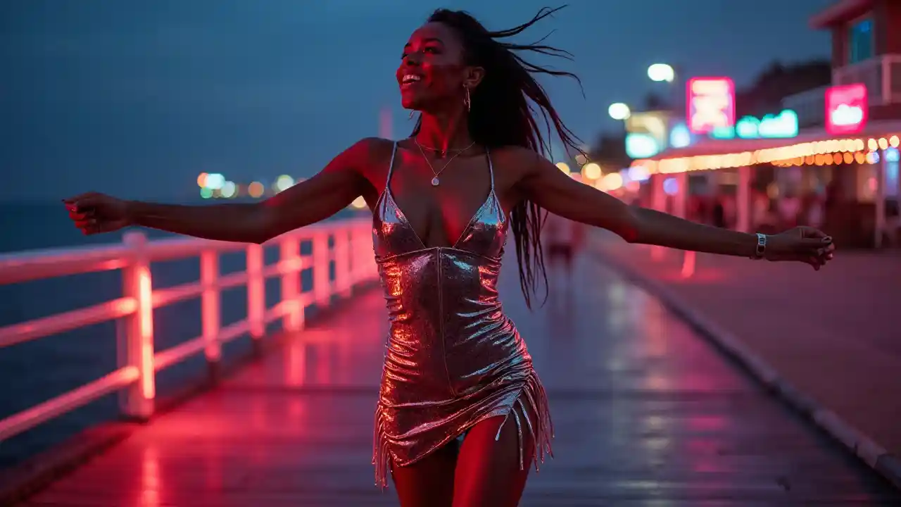 Dancing on a neon-lit pier, a Black woman in her 25s glows in a metallic mini-dress with fringe details. Glowing waves and city lights frame her, her toned legs and low-cut dress exuding vibrant energy and seductive charisma in a high-energy, coastal urban scene.