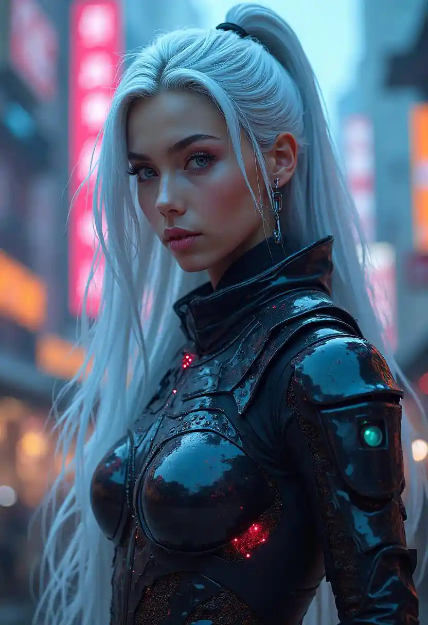 (((Woman, Samurai, Android, Silvery white hair, Long hair, Serious face, Japanese armor glowing with neon lights, Futuristic armor,))), Cyberpunk cityscape, Mas