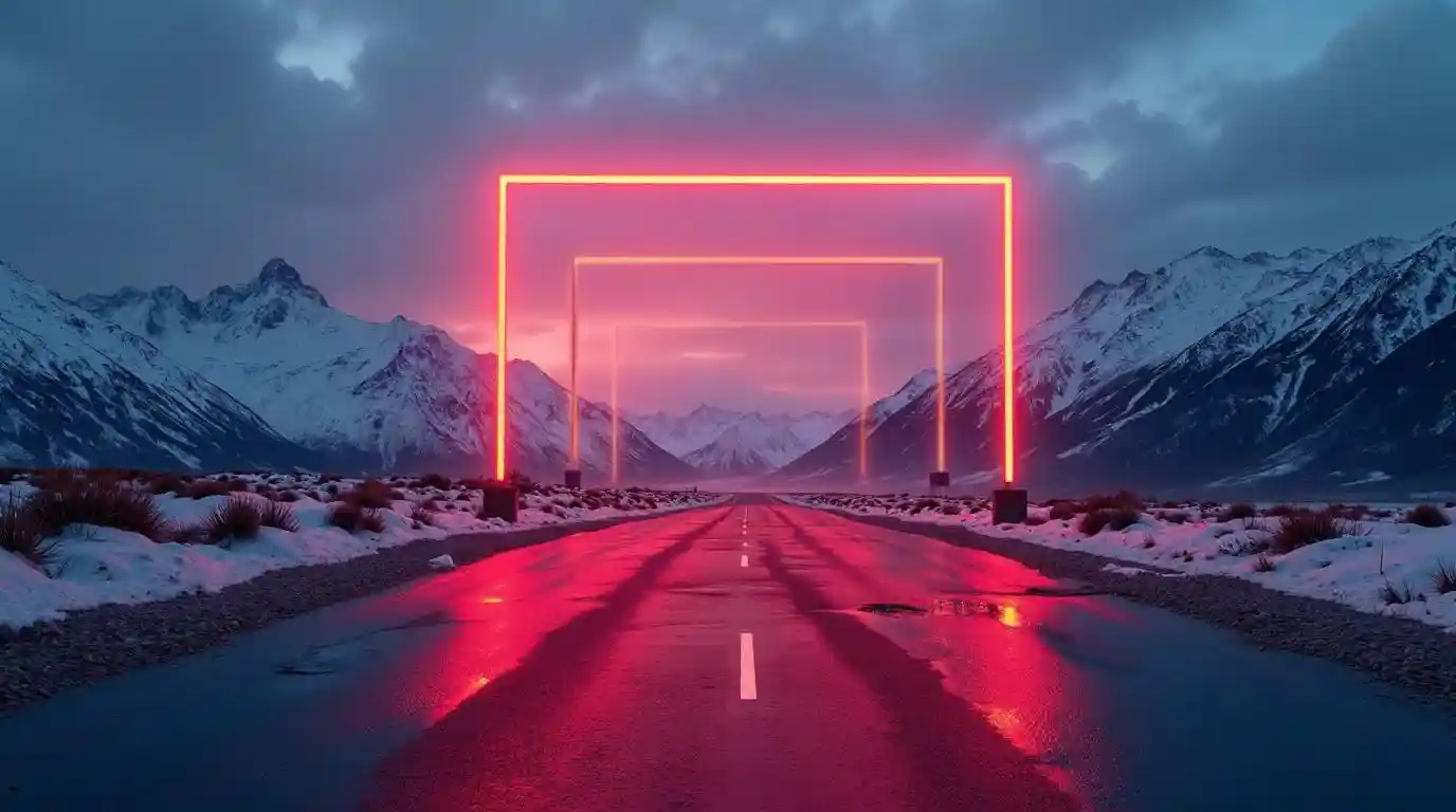 stxphred neon square in front of road against against nordic sky with mountains in the horizon