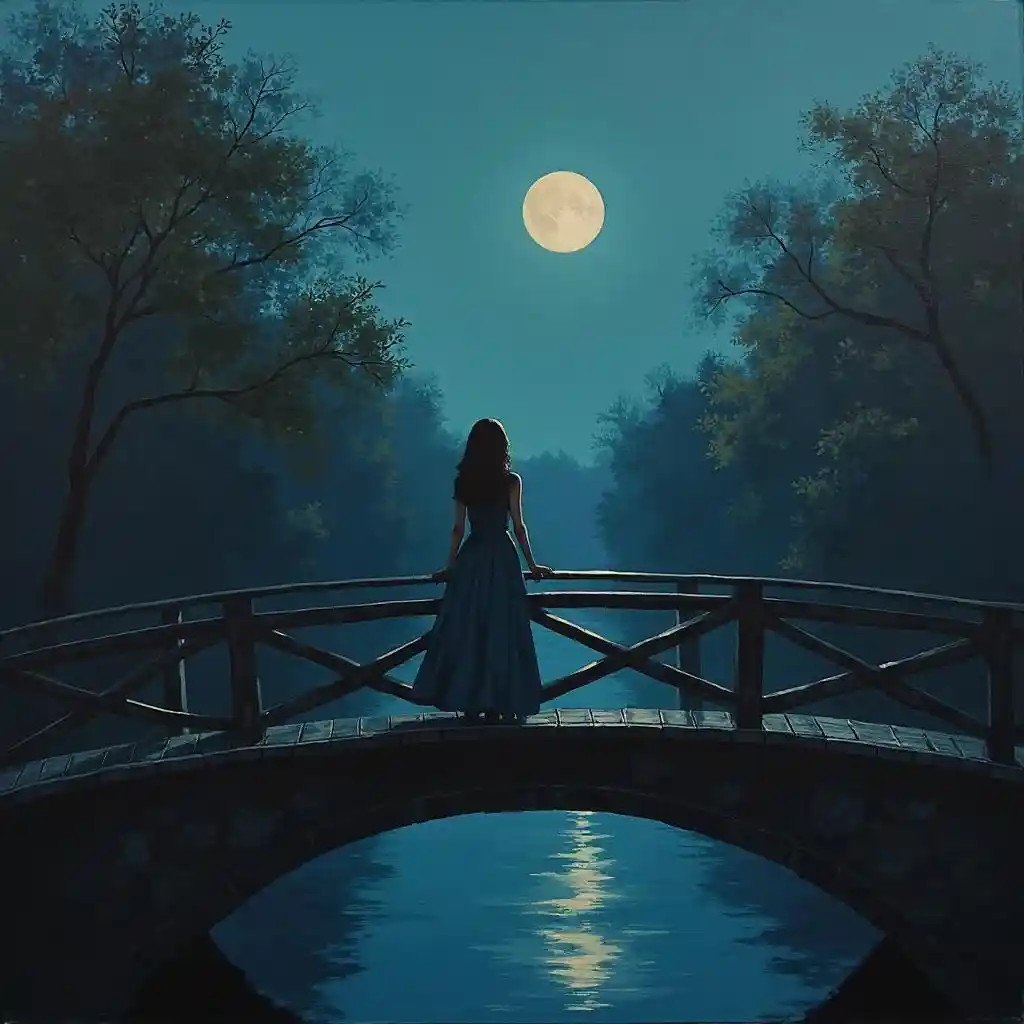 Painting of a woman on a bridge over a river at night