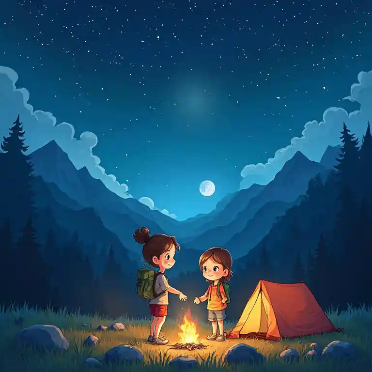 Matthewmasterpiece, best quality, ultra-detailed, illustration, 2 girls, outdoors, camping, night, mountains, nature, stars, moon, tent, cheerful, happy, backpack, sle