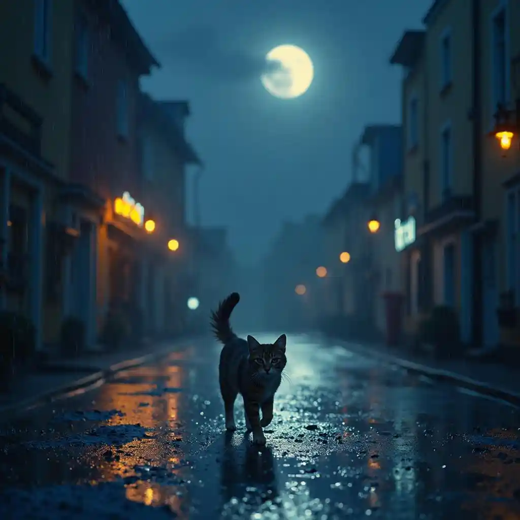 Cat Walking in Rainy Night City