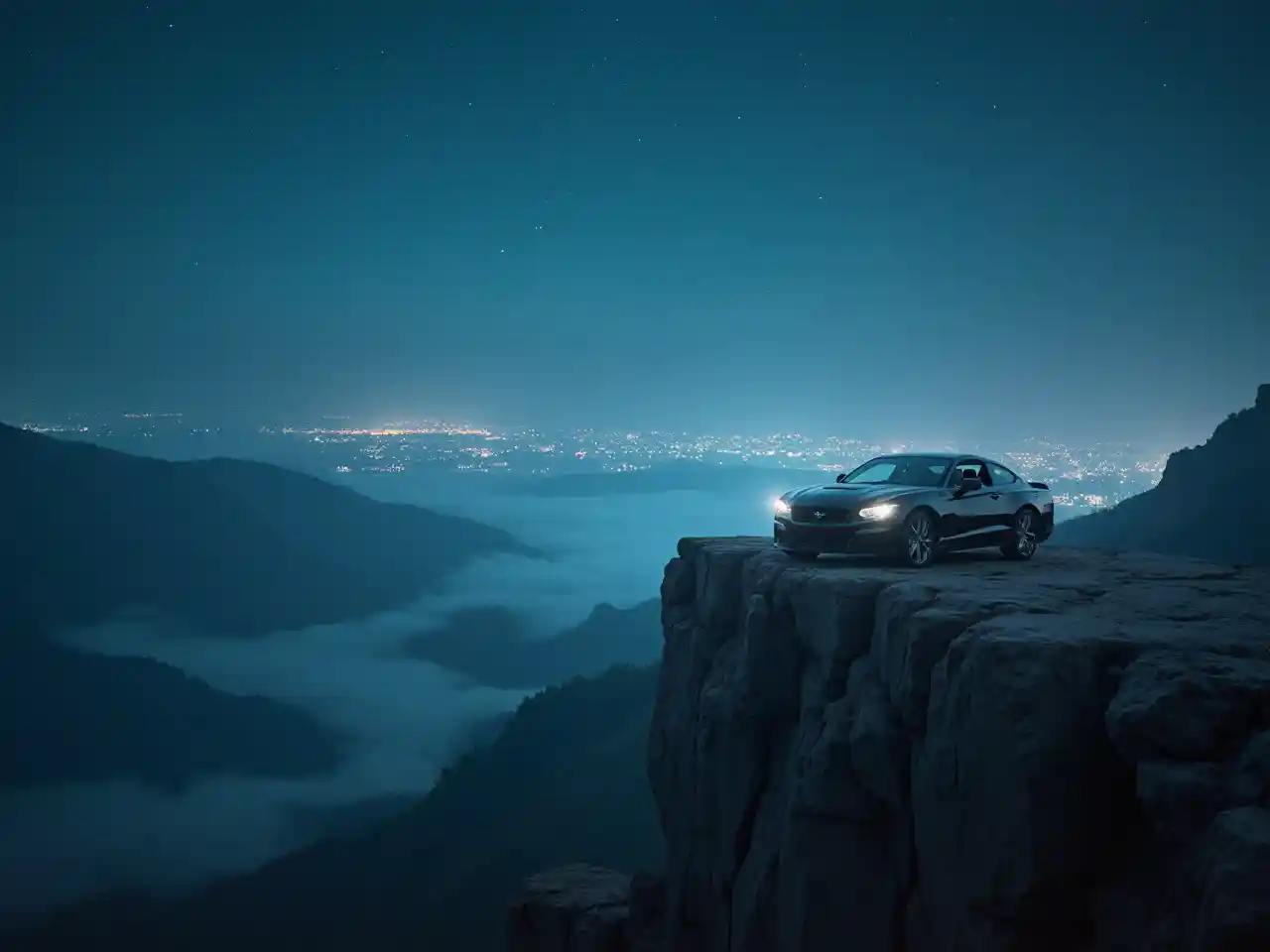 (car at night on the edge of a cliff), (infinite city skyline), illuminated lights, dramatic shadows, starry sky, cool tones, foggy atmosphere, exquisite detail, high contrast, cinematic composition, tranquil yet awe-inspiring ambiance, reflectivity of car surface, ultra-detailed, breathtaking perspective, dreamlike feel, adventurous spirit, 4K.
