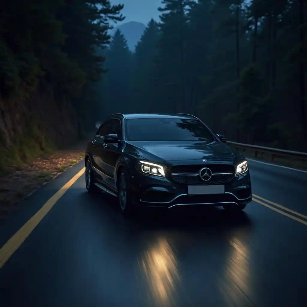 QinxueMercedes Benz car driving in the road with night light in the dark
