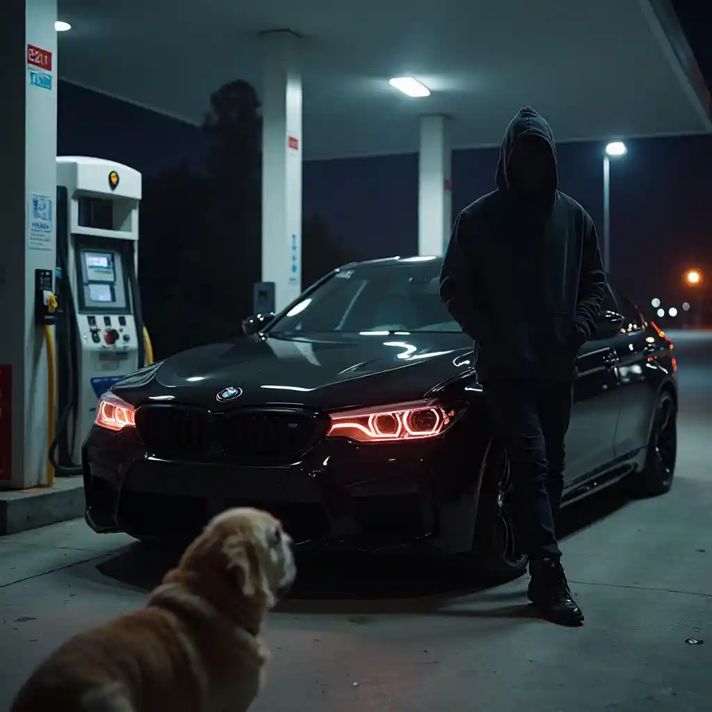 a guy in full black outfit hoodie with a balck mask looking mysterious in the gas station with his bmw m5 f90 3 turbo witha v10 engine which is full blac and its lits headlights are red with black rims in night with a dog and a iphone 16 pro max