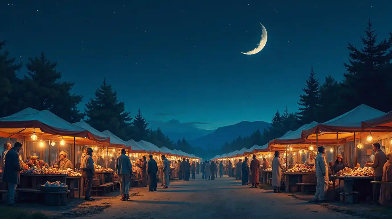 Night market under a starry sky, spirits peddling wares, echoing spirited-away vibes.