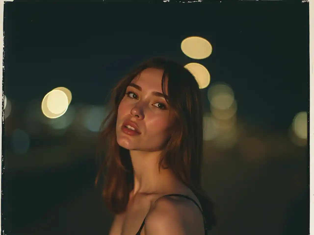 Zoepolaroid photo, night photo, photo of 24 y.o beautiful woman, pale skin, bokeh, motion blur