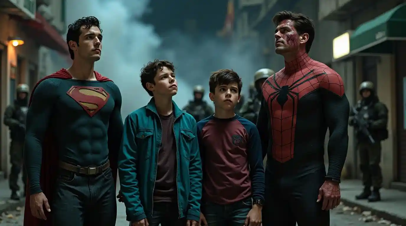At night, on a dimly lit, cluttered city street, four men stand close together, staring upwards in fear. On the far left is a Superman-like figure with an ‘X’ logo on his chest. His right hand rests on the shoulder of a young boy standing beside him. The boy was wearing a teal blue jacket over a dark red and black shirt with visible wrinkles and creases, and dark jeans underneath. To her right stands a comic book ‘Catwoman’. Her right hand is clasped tightly around her wrist, indicating nervousness or fear. On the far right is another dark-haired Spider-Man. This man shows signs of recent conflict, with visible cuts and faint red marks on his face, including visible petechiae near his right eye and cheekbone. A smoky atmosphere prevails in the background, with streetlights dimly lit and rubble strewn about, hinting at recent unrest or conflict. Several armed soldiers in combat gear can be seen standing in formation behind them, partially obscured by the smoke. The scene is set at night,