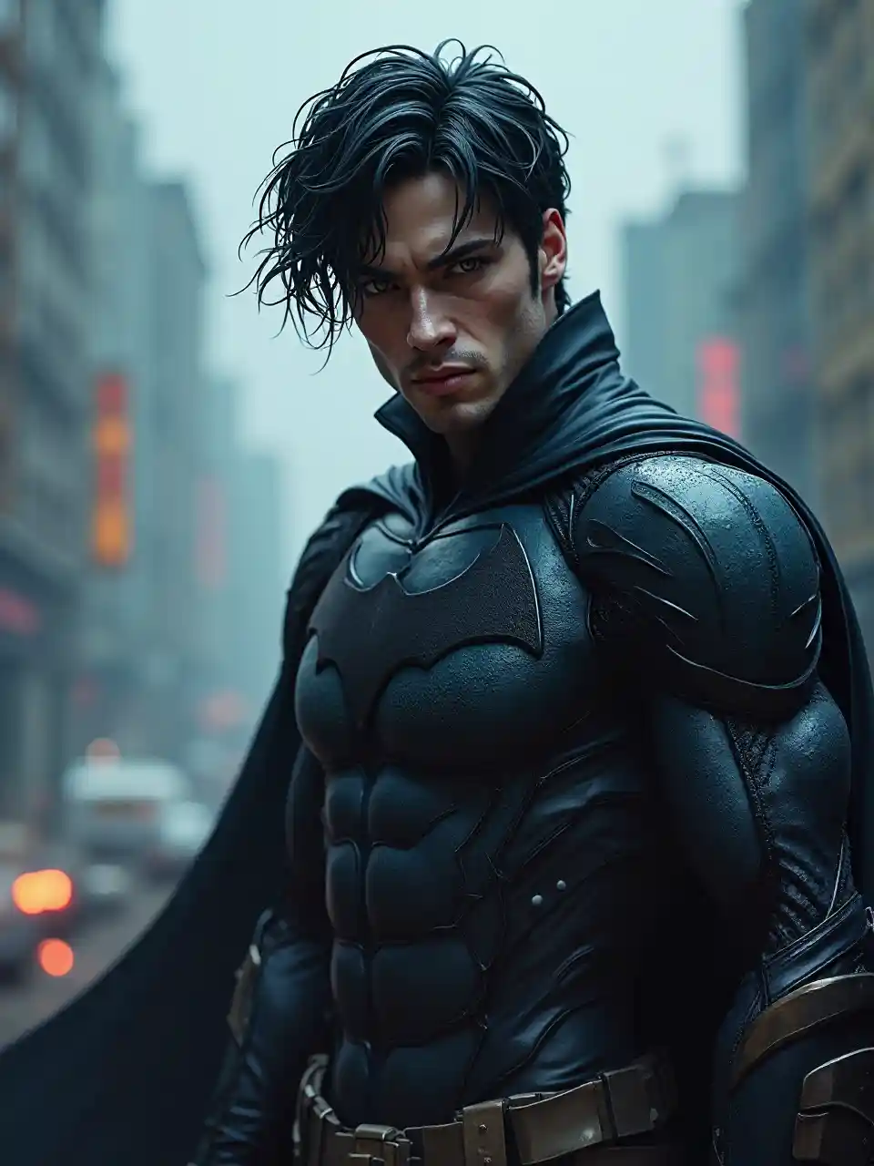 LucasNightwing, ultra realistic, destroyed city background, asian, 8k, dc comics