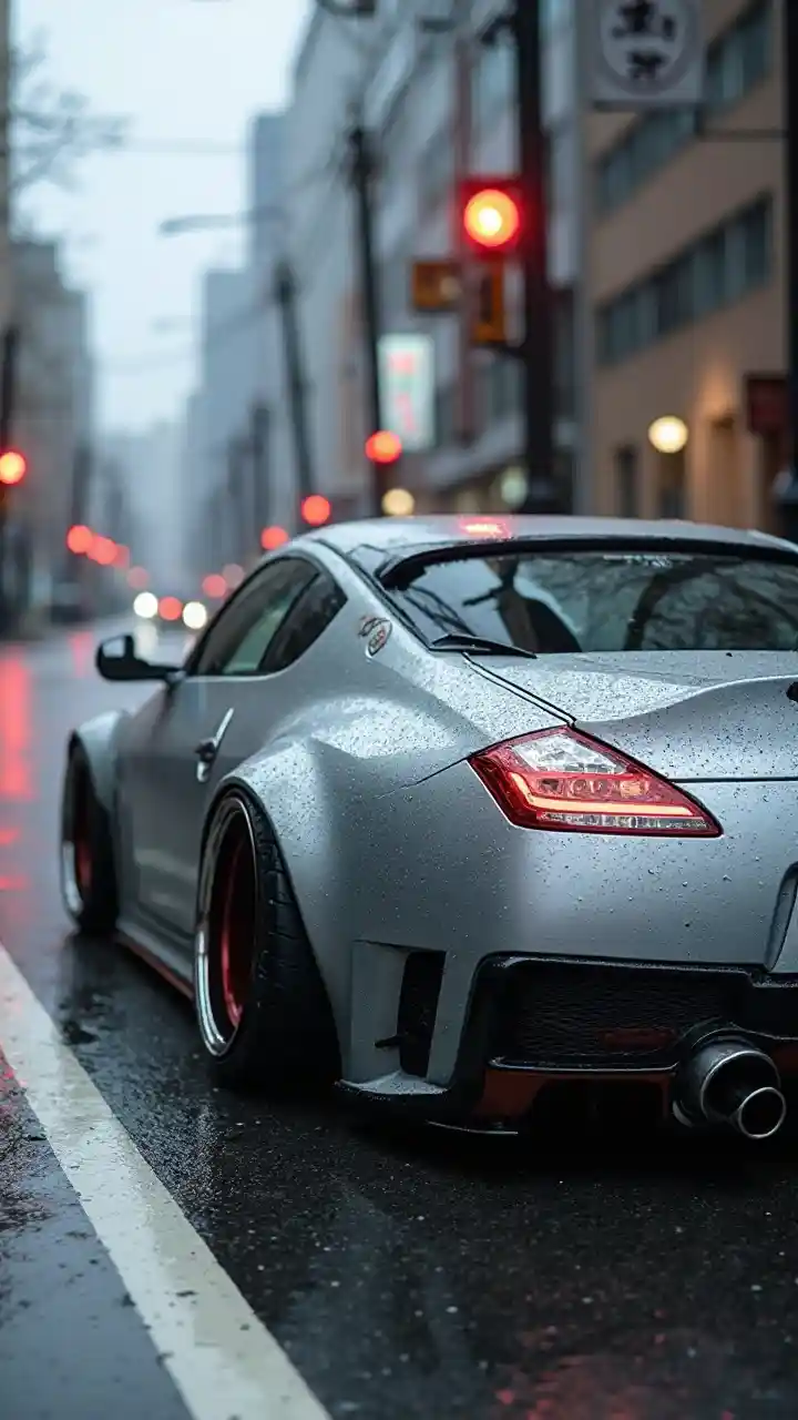 Stunning Sideview of a Silver Nissan 370z Nismo Under Rain